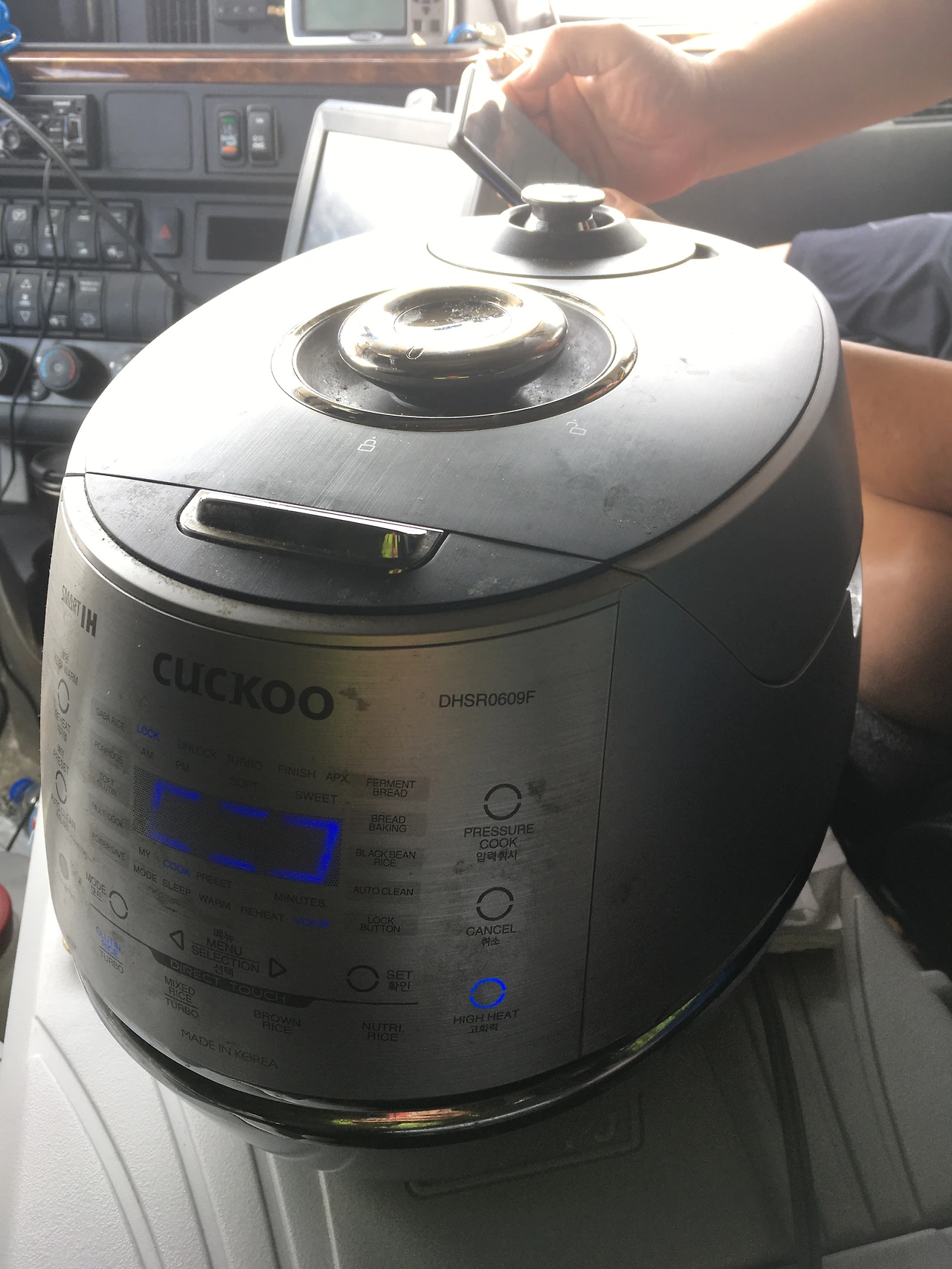 양쪽 집에서 반찬을 준비했고, 재선 형님이 쿠쿠 압력밥솥을 가져와서 식사 형편은 좋아졌다. 문제는 압력밥솥이 트럭에서는 전압이 낮은 탓인지 제대로 작동하지 않았다. 휴게소 건물의 일반 AC 아웃렛에서는 정상이다. 그래도 트럭에서 몇 번 밥을 지어 먹었다.