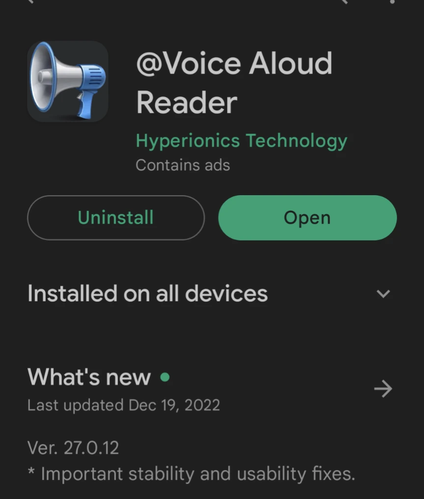 책 낭독 프로그램은 Voice Aloud Reader를 이용한다. 한국어도 잘 지원한다. 개발사 지원 차원에서 유료버전을 쓰는 데 얼마 안 한다. 화면을 끄거나 백그라운드 상태에서도 이용할 수 있다. 한국어 음성 합성 엔진은 구글 제품을 사용한다. 무료이며 품질이 좋다.