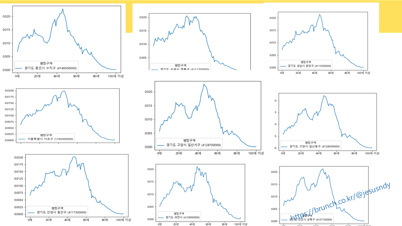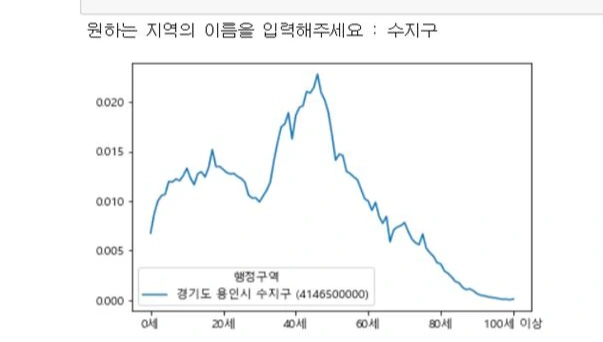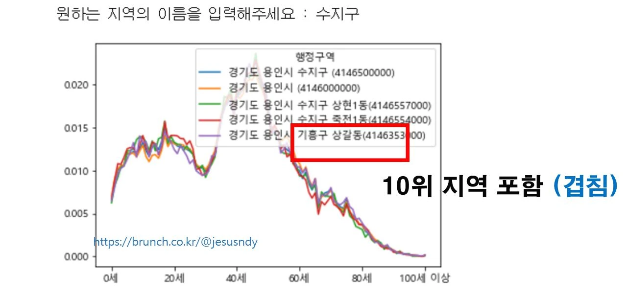 그리고 책(모두의 데이터분석)을 참고하여 상위 10개지역의 인구구조 그래프와 유사한 타지역의 그래프 5개를 보여주고 그 지역명을 보여주는 코딩을 돌려봤다. 1위 수지구를 입력한 결과 거의 비슷한 그래프로 기흥구 상갈동이 검색되었다.