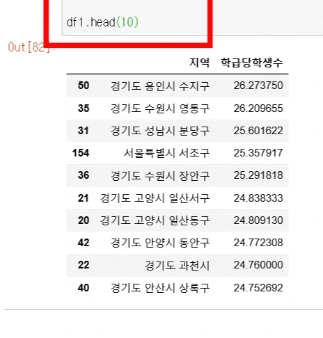먼저 파이썬의 판다스 프로그램을 통해 전국구 지역에서 학급당 학생수(초등학교 데이터만 뽑았습니다) 상위 10개 지역을 검색하였다.