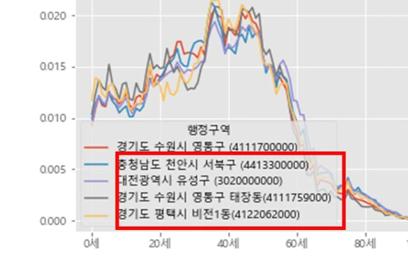 이런식으로 평균 학급의 학생수(초등학생기준) 전국 10위 안에 드는 곳의 인구구조 그래프를 그려보니, 과밀학급이 많은 지역과 인구구조 그래프가 비슷한 지역은 대전광역시 유성구, 천인시 서북구, 평택비 비전1동, 광명시 소하2동, 고양시 주엽1동, 고양시 풍산동, 덕양구 행신3동, 양천구 신정7동, 의정부시 송산1동, 의정부시 신곡1동이 검색되었다.
