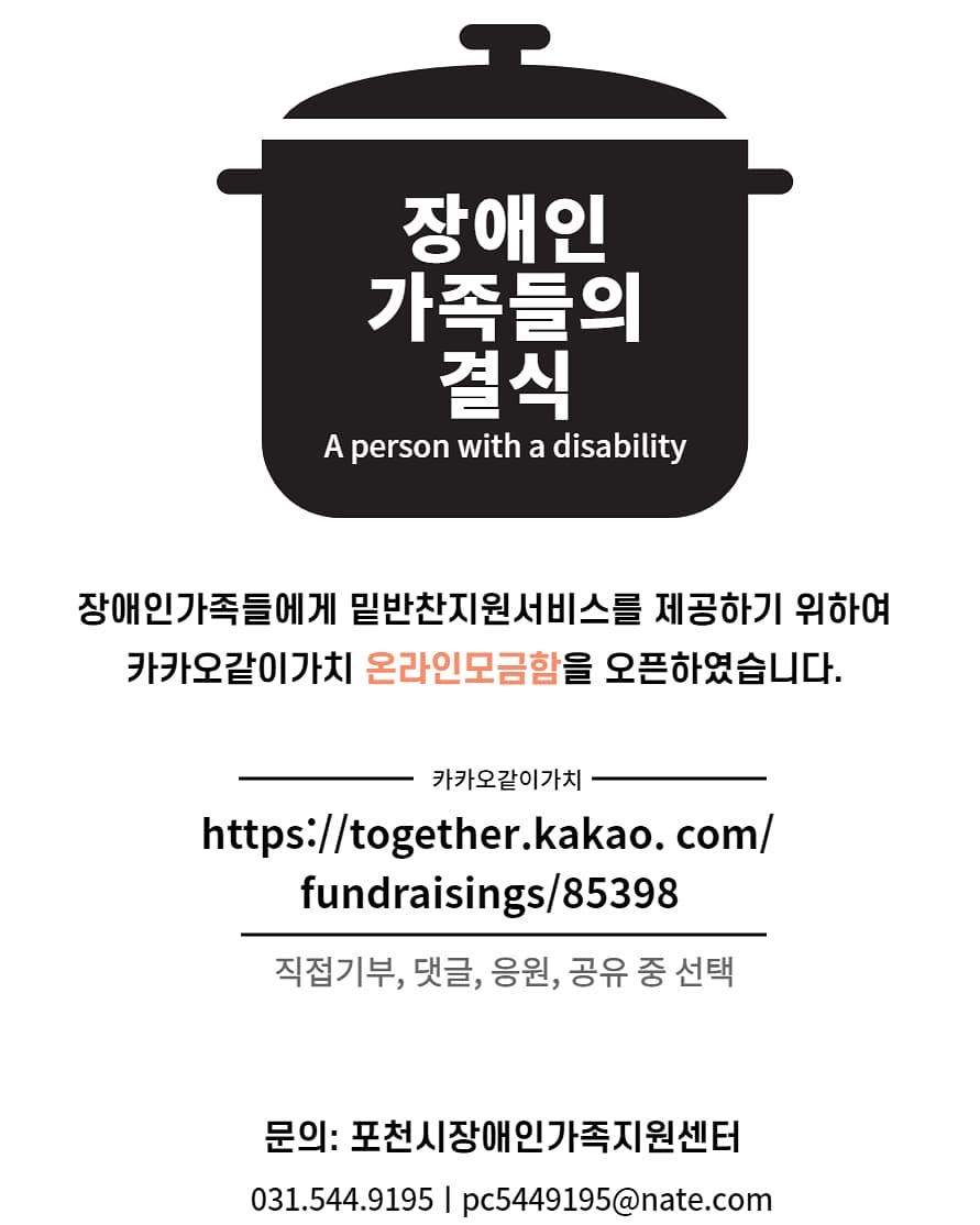 포천시장애인가족지원센터는 장애인가족들의 결식 예방을 위하여 찾아가는 밑반찬배달서비스 “따뜻한 온(溫) 정” 사업을 추진하기 위하여 다음카카오 같이가치 온라인 모금사업을 진행합니다. 함께 참여하는 방법은 먼저 https://together.kakao.com/fundraisings/85398 클릭을 하고 포천시장애인가족지원센터 온라인 모금 내용을 확인한 후 기부방법(직접기부(카카오톡, 신용카드, 휴대폰 결제 등), 댓글 100원, 공유 100원) 선택하여 후원을 하면 됩니다. 이번 온라인 모금을 통해 장애인가족들에게 맛있고 따뜻한 밑반찬 제공이 가능토록 많은 분들의 관심과 후원을 부탁드립니다. 감사합니다.
