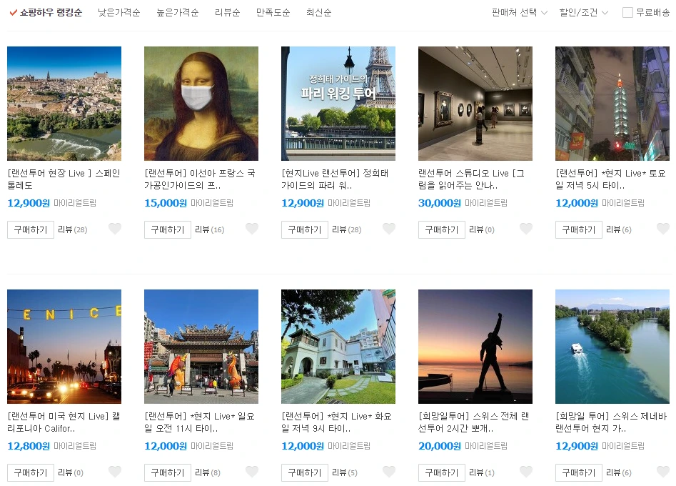 그렇게 해외여행에 대한 추억이 잊혀갈 무렵, 이제는 실제로 가지 않고도 해외를 구경하는 랜선투어가 등장했다. 코로나19 이전에도 있었는지는 모르겠지만, 대부분의 사람은 들어보지 못했을 매우 생소한 단어였다. 만원 초반 정도가 보통 가격이었는데, 실시간 스트리밍으로 해외여행을 송출하는 것 같았다. 코로나19 이전에 해외 각지에서 가이드를 하던 한국인들도 많았을 것이므로, 그 사람들이 여행사를 통해 랜선투어를 진행하는 모양이다.