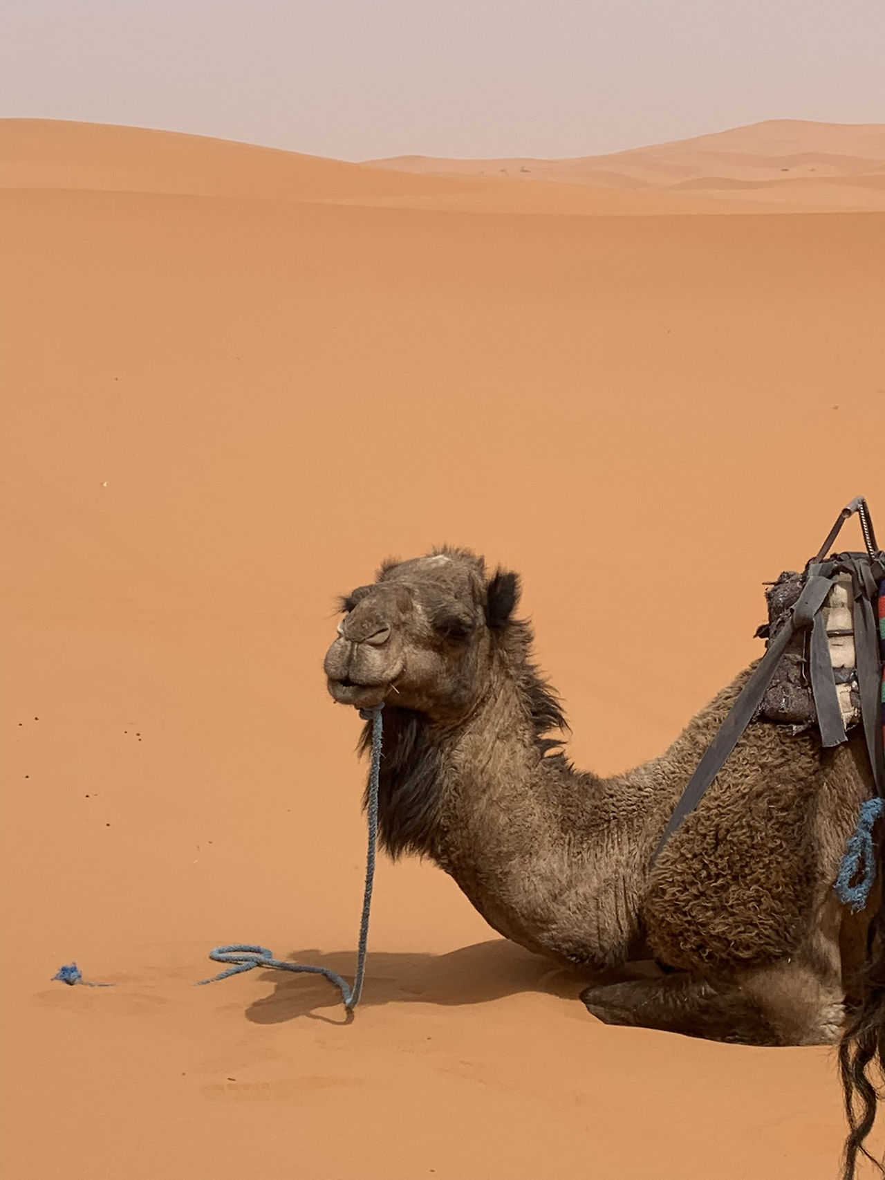 낙타를 타고 들어가는 사막 투어는 오전 11시부터 시작이었다. 밥을 먹고 잠시 쉬다가, 다시 선크림을 바르고 뜨거운 모래 바람을 막아줄 히잡도 썼다. 원하는 색의 천을 고르면 직원분이 머리에 둘러주셨다. 나는 시원한 하늘색 히잡과 흰색 옷을 입고, 시간이 될 때까지 멍 때리며 기다렸다. 드디어 11시! 11시 투어에 신청한 사람은 우리 일행 3명을 포함해 5명이었다. 인솔에 따라 숙소 밖으로 나가자, 낙타 다섯 마리가 열을 맞추어 대기하고 있었다. 내가 모로코에 온 목적이 바로 이 낙타들을 보는 것이었지,라는 감상에 빠져있을 때쯤 저기에 어떻게 올라타지?라는 걱정이 몰려왔다.
