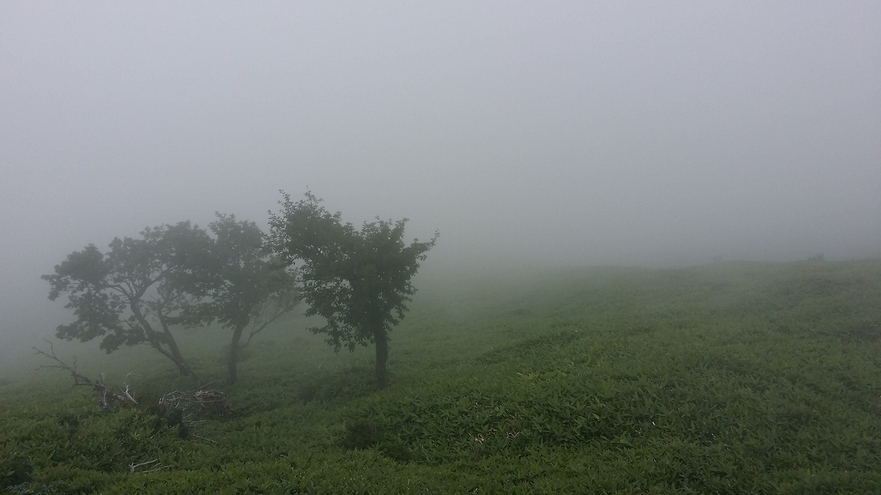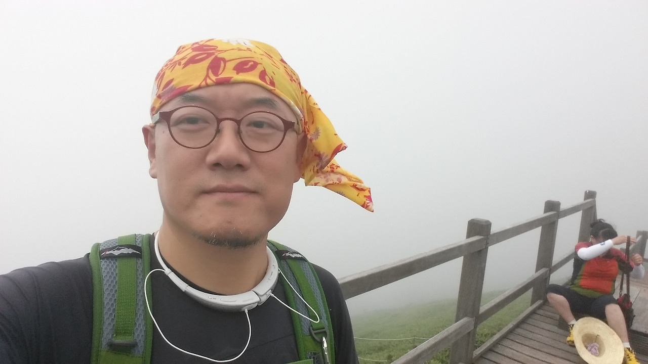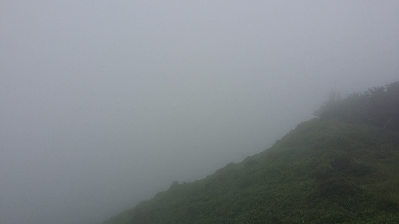 정상의 데크에 앉을 때만 해도 멀쩡하던 날씨가 서서히 변한다. 아래에서부터 구름이 급하게 산정으로 오르기 시작하더니 그나마 조금 보이던 주변의 모습이 서서히 구름 속으로 묻힌다. 구름을 정상으로 몰아세우는 바람이 거세지자 그 사이를 뚫고 빗방울이 떨어지기 시작했다. 땀에 절어있는 상태에서 맞는 빗방울은 예상외로 시원하다.