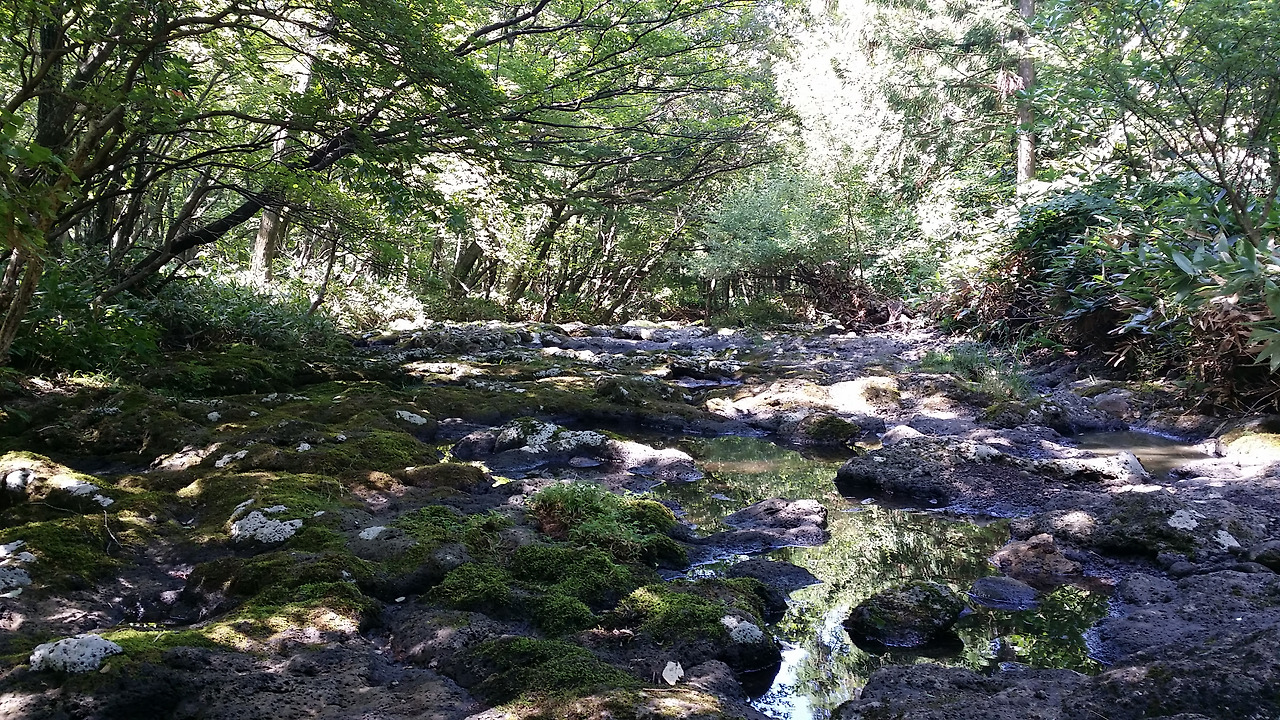 어느 순간 조릿대 숲을 장악한 듯하더니 다시 새로운 숲의 모습을 보여준다. 하천이 있고 돌이 마냥 검은색이 아닌 흰색이 섞인 돌이 하천변을 가득 채우고 있다. 어찌 보면 검은색 돌에 이끼가 낀 모습보다 더 생경하다. 숲에서 순간순간 어두운 공포가 느껴질 때가 있다. 한라산에서 경계를 풀지 말라는 신호처럼 보인다.