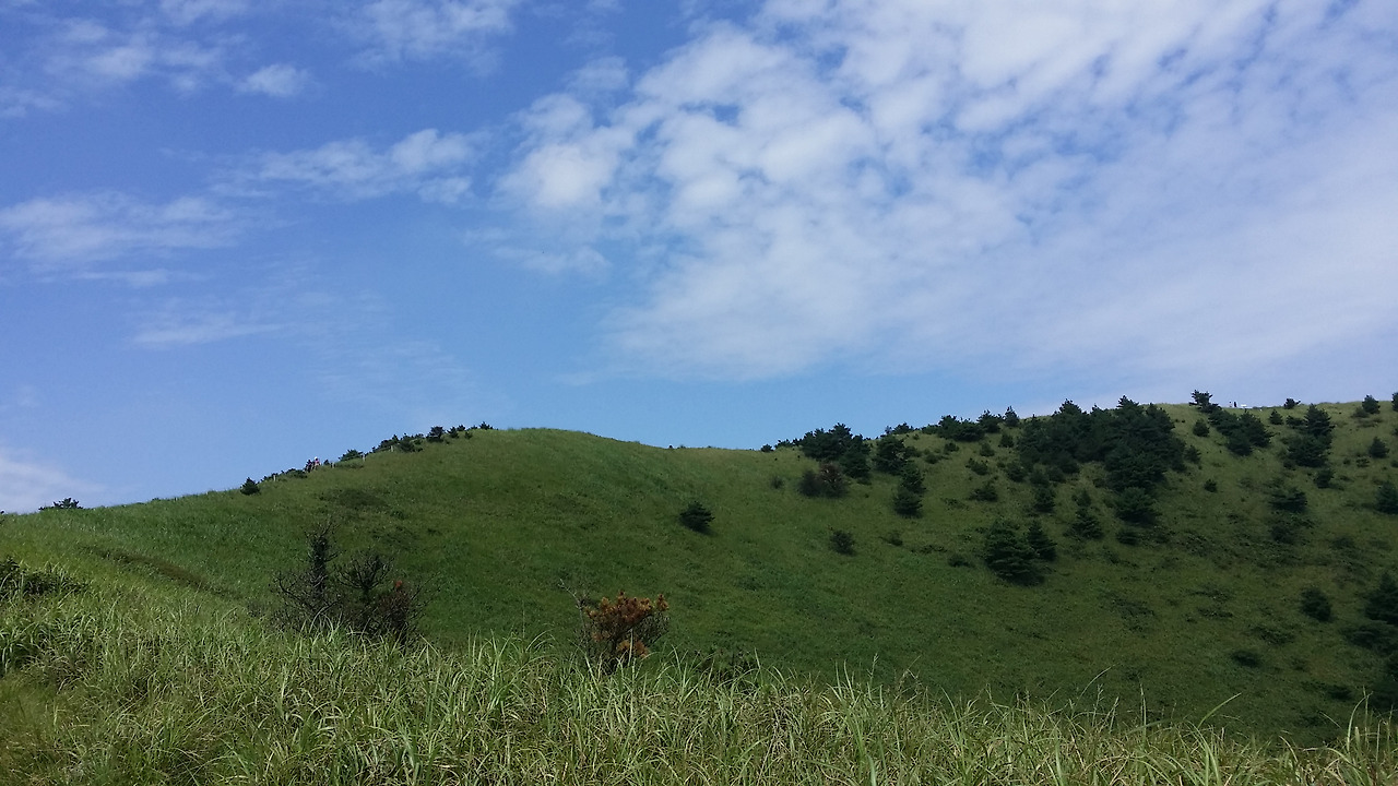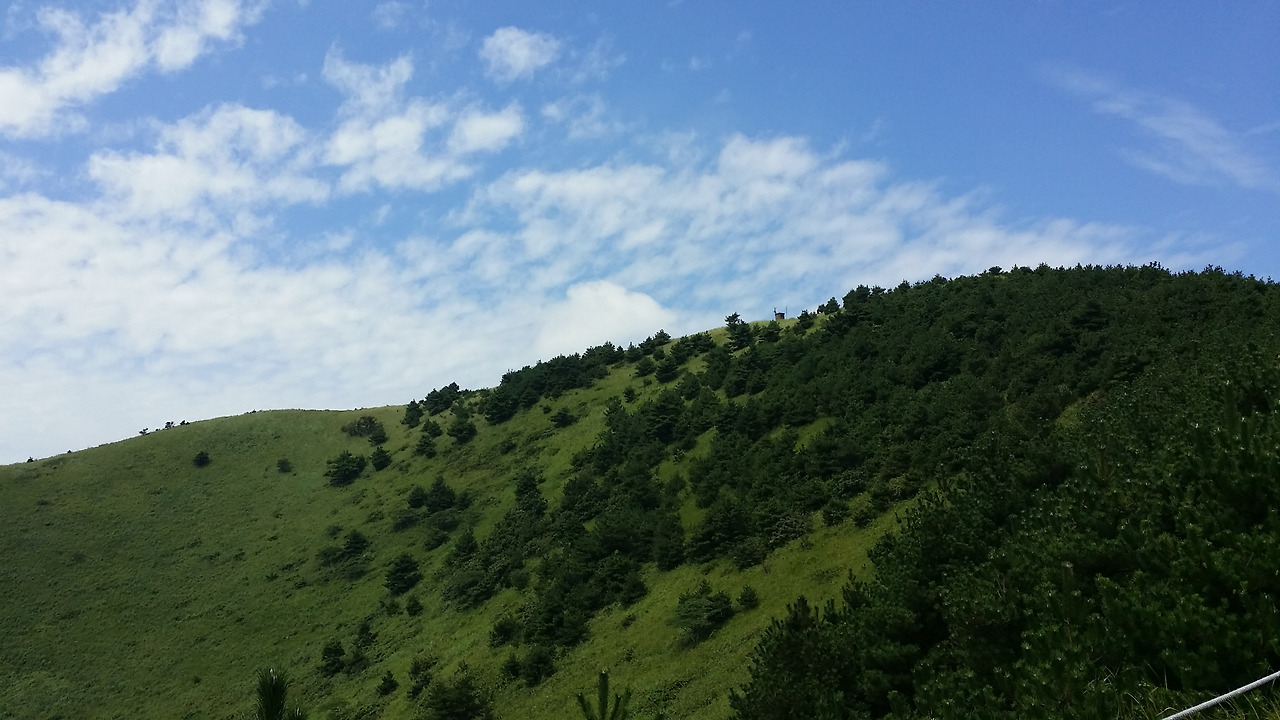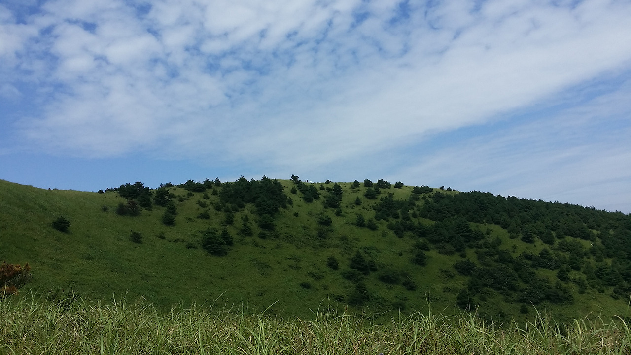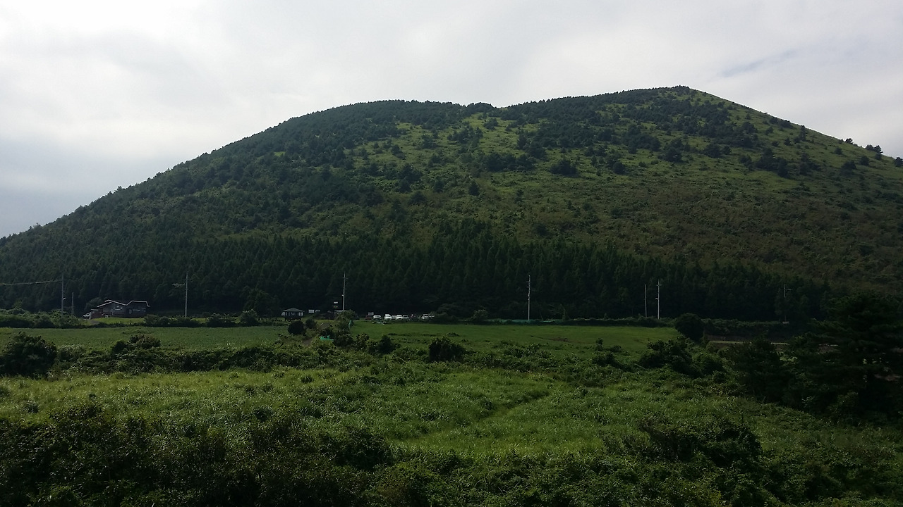 봉우리가 말발굽형처럼 한쪽으로 용암이 흘러내린 구조가 아닌 온전한 분화구를 갖춘 곳이라 오름을 한 바퀴 돌며 느끼는 상쾌함은 멋지다 못해 여유롭다. 다른 오름이라고 왜 한 바퀴 돌곳이 없겠는가 마는 이 오름의 분화구는 돌면서 분화구와 뒷 배경이 아주 조화롭게 나그넷길 같은 느낌을 전달해주는 재주가 있다.