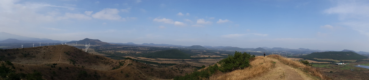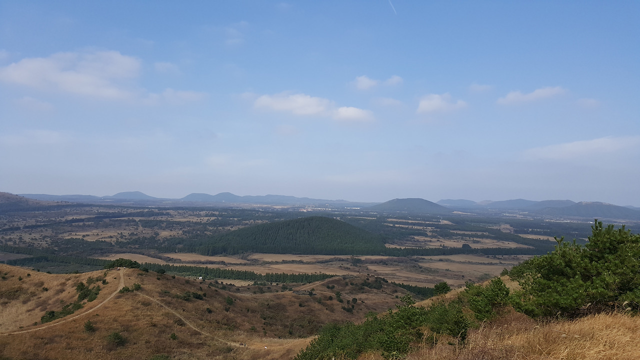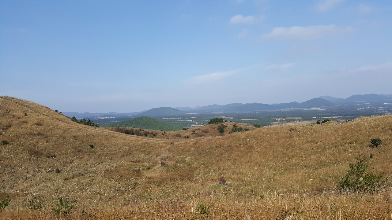 정상에 올라 잠시 쉬고 있는데 동쪽편의 오름들이 한눈에 다 들어온다. 조금조금씩 서쪽으로 온 이유도 있겠지만 이추룩 많은 오름을 한꺼번에 본 적이 없을뿐더러 식별이 가능한 적이 없었다. 나도 많은 오름을 알고 있다. 기쁘다. 사진에 보인 이름과 내가 알고 있는 이름을 맞춰보니 거의 알겠다. 가보지 않은 곳도 많지는 않아 괜한 뿌듯함이 가슴속에서 올라온다. 이미 힘을 내서 올라오느라 더위가 온몸을 덮였는데 뿌듯함마저 일어나지 옷을 벗어도 전혀 춥지 않겠다. 실제도 날씨는 그다지 춥지 않다.