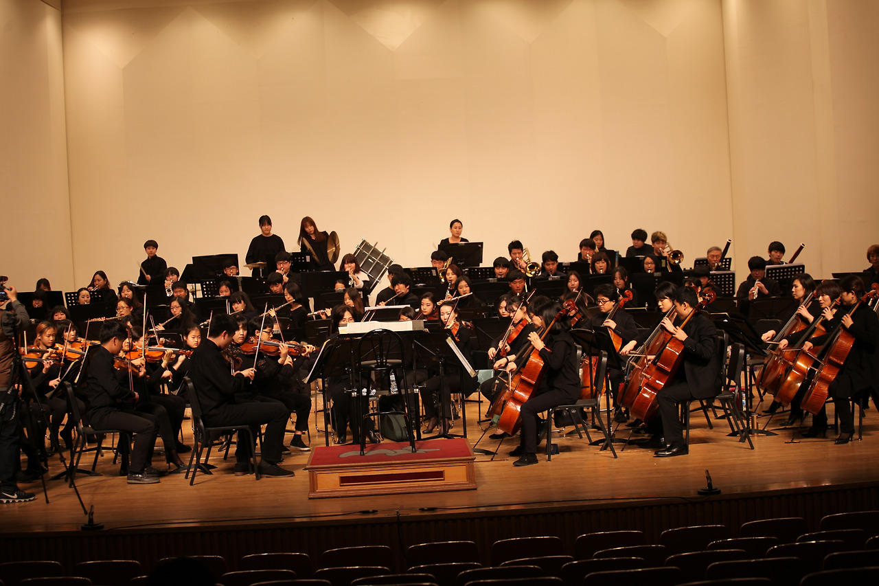 얼핏 보아도 백 명은 되는 숫자다. 아주 앳되어 보이는 아이부터 늙수그레한 어른, 키가 190은 족히 넘는 청년이 제1바이올린 자리에 앉아있다. 저렇게 큰 녀석이 섬세하게도 악기를 열심히 연주하는 게 신기하기만 할 다름이다.