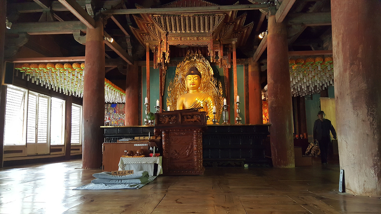 다른 절의 대웅전과 달리 부처상이 옆으로 놓여있다. 문을 활짝 열면 그 앞에 3명의 부처상이 있기 마련인데 한분밖에 없는 데다가 정면이 아닌 좌측을 바라보고 있다. 연유가 뭘까. 내부 구성이 특이하다. 옆으로 놓음으로써 공간 구성에서 한쪽이 소외되는 느낌이다.
