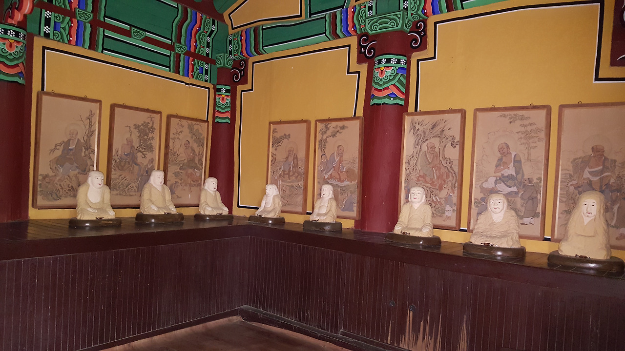 나한이 모셔져 있는 자인당은 불을 켜놓지도 않아 분위기가 어둡고 음산한 느낌이다. 실제로 나한들이 저 같은 어두운 포스를 가지고 있는지도 모를 일이다.