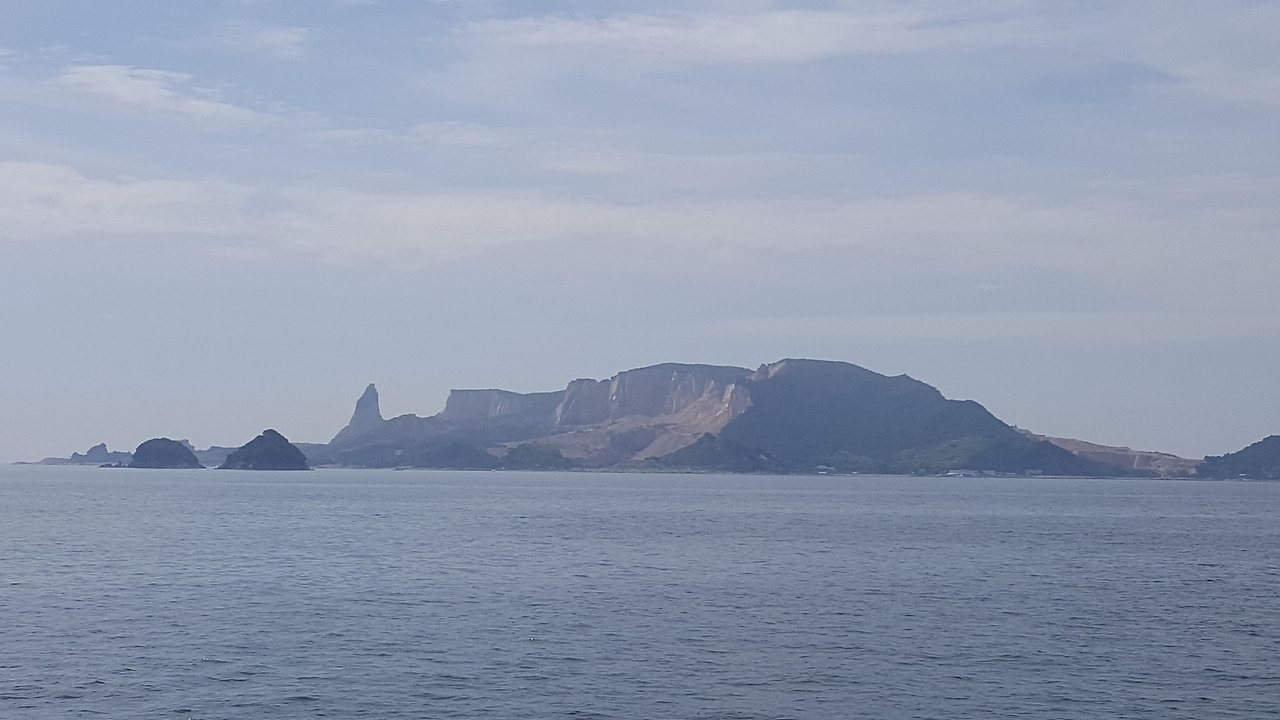 한참을 항해하는 배 너머로 섬이 눈앞에 들어온다. 바다 한가운데 떠있는 섬의 모습이 특이하다. 푸르른 나무로 덮여있으리라고 생각했는데 신기하게도 벌거숭이 섬이다. 누군가 인위적으로 파헤쳤는지 반쪽이 날아가버린 모습을 하고 있다. 나머지 섬이 일부분 남아 황토색 섬의 속살을 그대로 드러내고 있다. 무슨 사막의 커다란 산을 연상시키는 모습이 바다 한복판에 드러나는 것은 여간 생경한 모습이 아닐 수 없다.