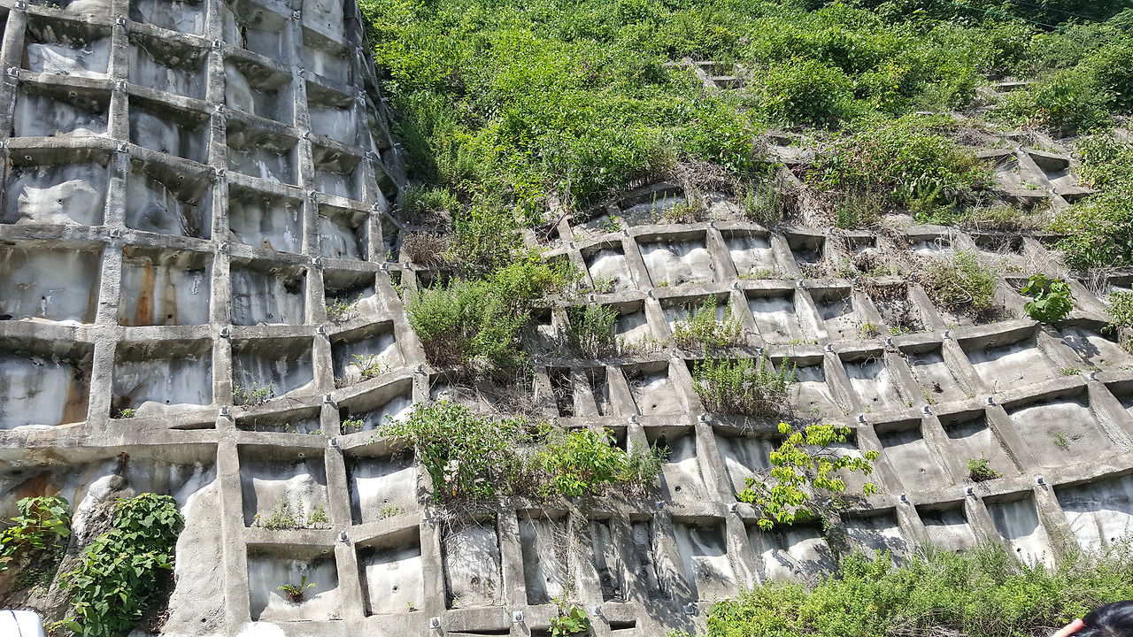 항구를 한구비 돌아 나서자 극적인 모습이 나온다. 비탈진 섬 위를 개발하고 사고를 방지하기 위해 사방공사를 한 모습이 극명하게 드러난다. 마치 와플을 확대한 듯한 모습에서 이질감과 함께 경이로움이 돋보인다. 일본의 환경에 대한 처절한 대응능력은 대단하다는 느낌이다.