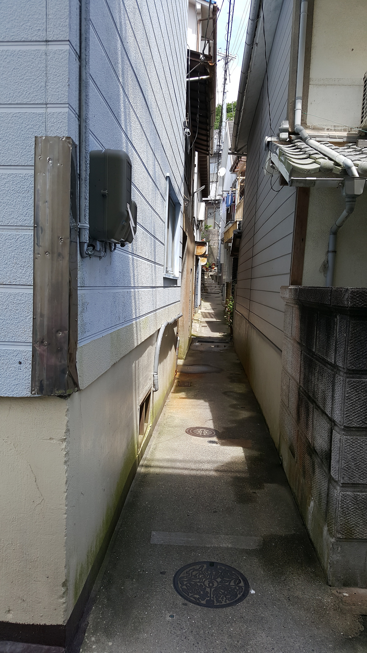 카주야 상이 갑자기 안내를 하던 중 방향을 왼쪽으로 튼다. 아주 좁다란 겨우 사람 한 명이 다닐 수 있는 길이라고 하기에도 어려운 담장 뒤편의 공간으로 우리를 이끈다. 그는 이곳도 중요한 길입니다. 사람들이 자주 이용하는 길목이지요라고 설명한다.