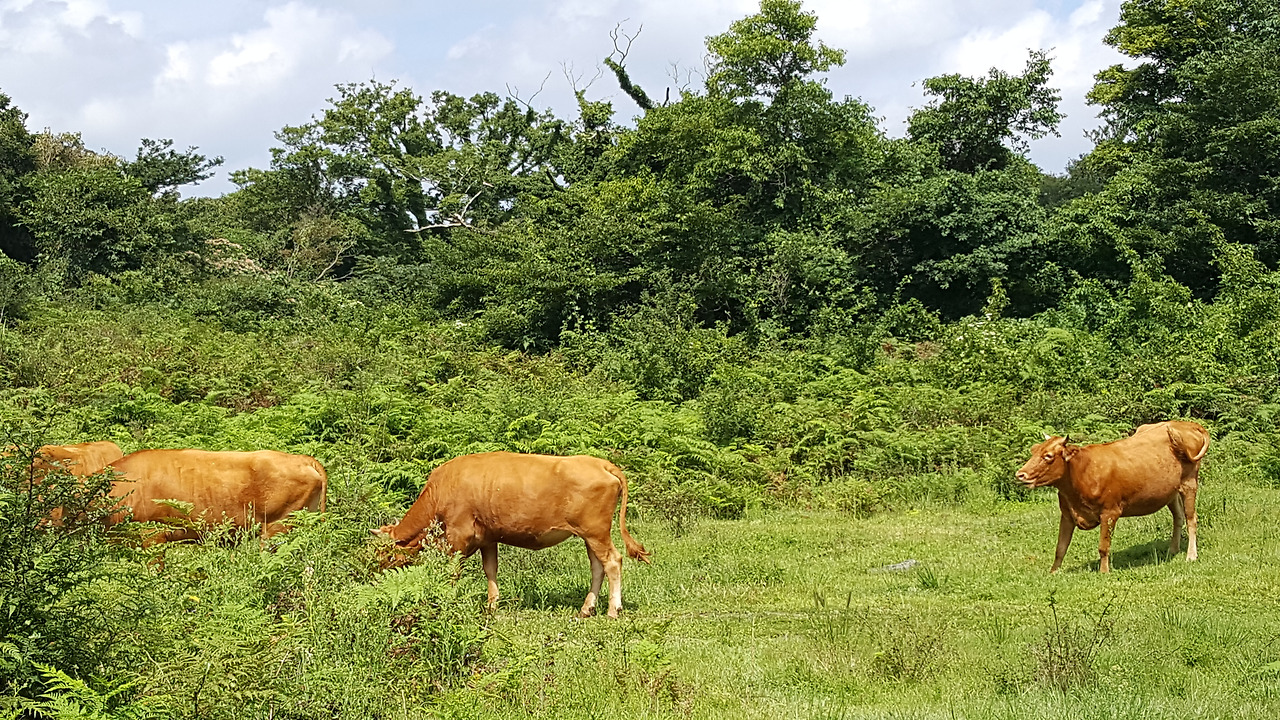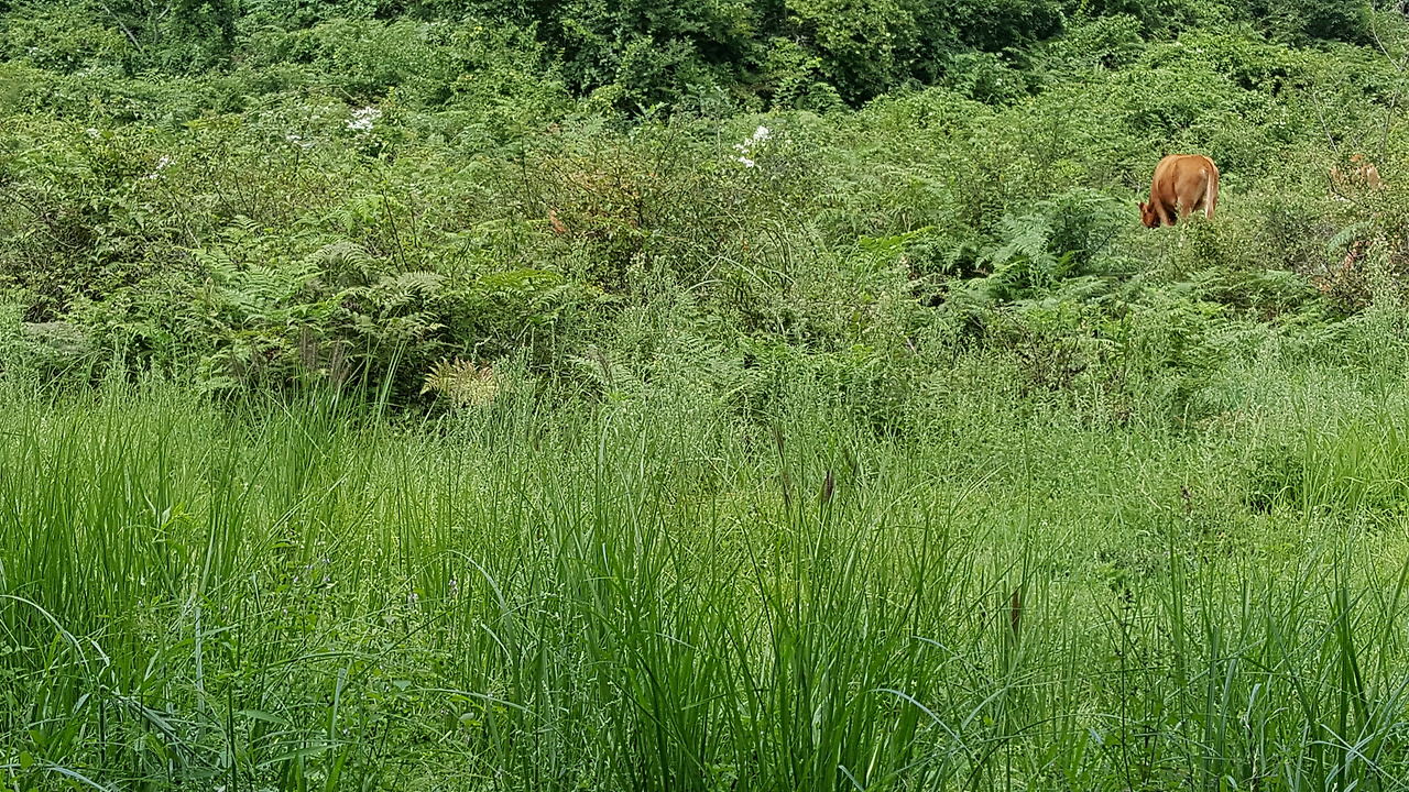 한참을 걷다 보니 원두막이라는 팻말이 보인다. 30m 거리에 있단다. 지나는 길에서 옆으로 빠져들어가는데 번거롭다는 생각이 들지만 왠지 모르게 잠시 쉴 겸 방향을 튼다. 한 팀이 마루에 앉아 쉬고 있다. 그보다는 주변 풀밭에서 유유자적하는 소들이 눈에 띈다. 평화로운 모습이다. 높게 자라난 풀들과 그 주변을 맴돌며 풀을 씹어 드시는 우리의 소님들에게 시선을 주다 보니 참 팔자 좋은 녀석들이라는 생각이 든다. 한참을 쉬면서 세월을 낚는 기분으로 주변의 경치에 취해본다. 하늘은 적절히 파랗고 구름도 끼어있어서 많이 덥지 않다. 찌뿌둥하리라는 생각과는 조금 멀다. 그래도 아직 여름의 뜨거운 여운이 남아있는 기분이다.
