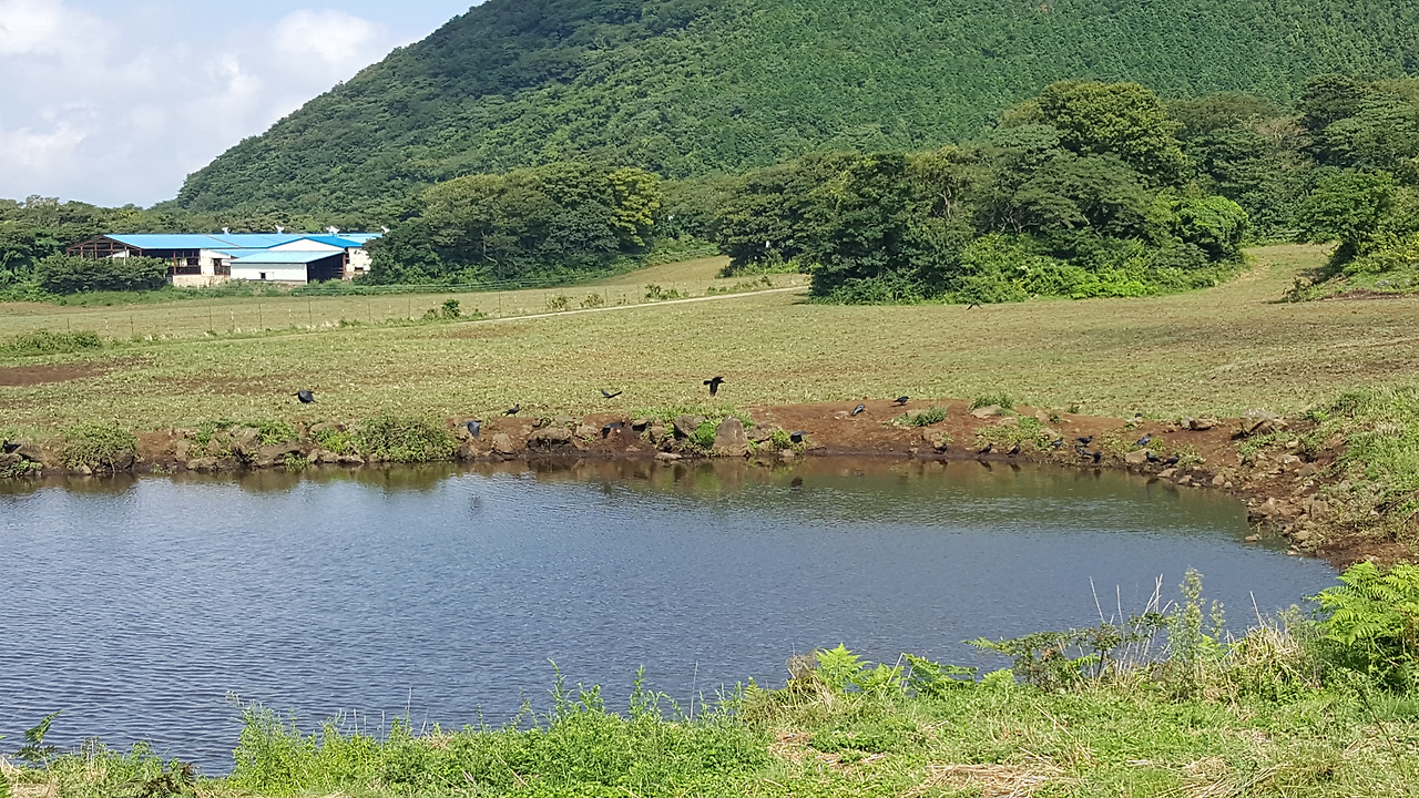목장의 정체는 모를 일이지만 한가운데 연못이 보인다. 보기 드문 장소다. 말이나 소의 물을 먹이기 위한 장소일 터지만 그들 대신에 까마귀들의 오아시스 역할을 충분히 하고 있다. 보기 드문 풍경인지라 한참을 쳐다보며 길을 재촉한다.