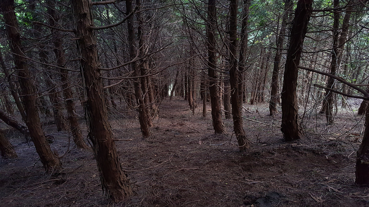 어렴풋이 보이는 목장의 초원까지는 20m 정도가 남았다. 거의 온몸을 구부리다시피 하며 나무를 제치고 내려가는 찰나. 내가 오름 탐방을 하면서 가장 두려워하는 상황이 발생했다. 뒤쪽 어디선가 들개의 맹렬한 울부짖음이 들리기 시작한다. 순간 예전에 오름을 다니며 심리적으로 쫓기던 생각이 나기 시작한다. 발걸음을 빨리 옮기려 하지만 이놈의 잡목 엉킨 숲이 나에게 길을 내어줄 리가 없다. 속도는 안 나고 마음은 바쁘다 보니 제대로 길을 만들기보다 막무가내로 수풀 속을 헤치며 내려가기 시작한다.