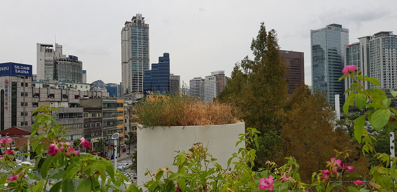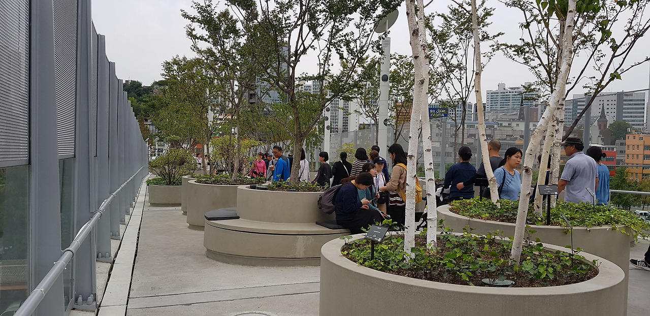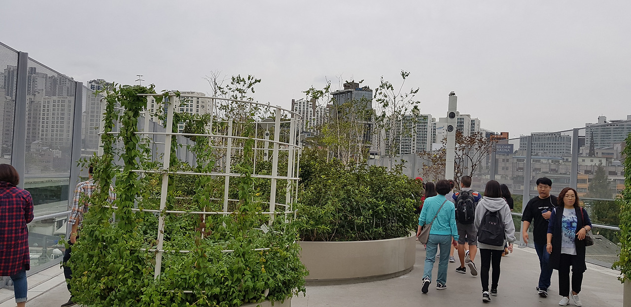올라간 7017은 다양한 명성이 있는 때문인지 수없이 많은 사람들이 고가 위를 서성이고 있었다. 이곳저곳의 입출구가 있는 때문인지 나에게는 우왕좌왕하는 도시민들이 한 군데 모여 갈피를 못 잡는 듯한 인상이었다. 결론부터 이야기하자면 무엇을 보라는 것인지 알 수가 없었다. 나의 무지 때문이리라. 개념으로 치자면 공중정원을 생각했을 터인데 공중정원이라는 이름을 붙이기에는 커다란 시멘트 화분을 고가 위에 설치해 놓은 것일 뿐 그 이상을 느끼기에는 내 감성의 폭이 넓지 않다. 그래서인지 우왕좌왕하는 사람들의 무리가 입출구를 달리할 뿐 뜨내기의 인생같다는 느낌을 지울 수 없다.