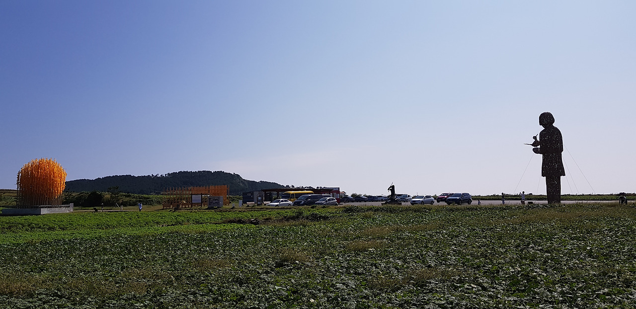 처음 알뜨르 비행장의 비엔날레 주차장을 찾았을 때 노란색 만장 깃발이 산방산을 대체할 만한 내용인가 하는 생각이 가장 먼저 떠올랐다. 혹은 전면에 거대하게 세워놓은 소녀상이 상징성을 떠나 의미 있는 대체품이 될 수 있는가 하는 의구심도 함께 떠올랐다.