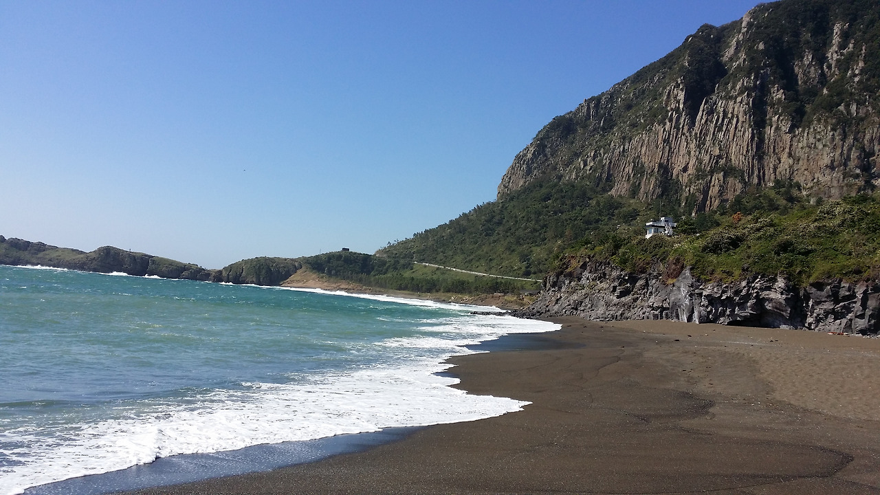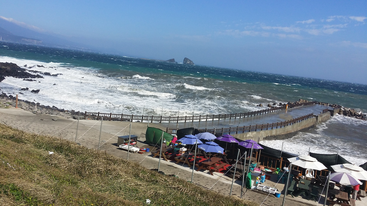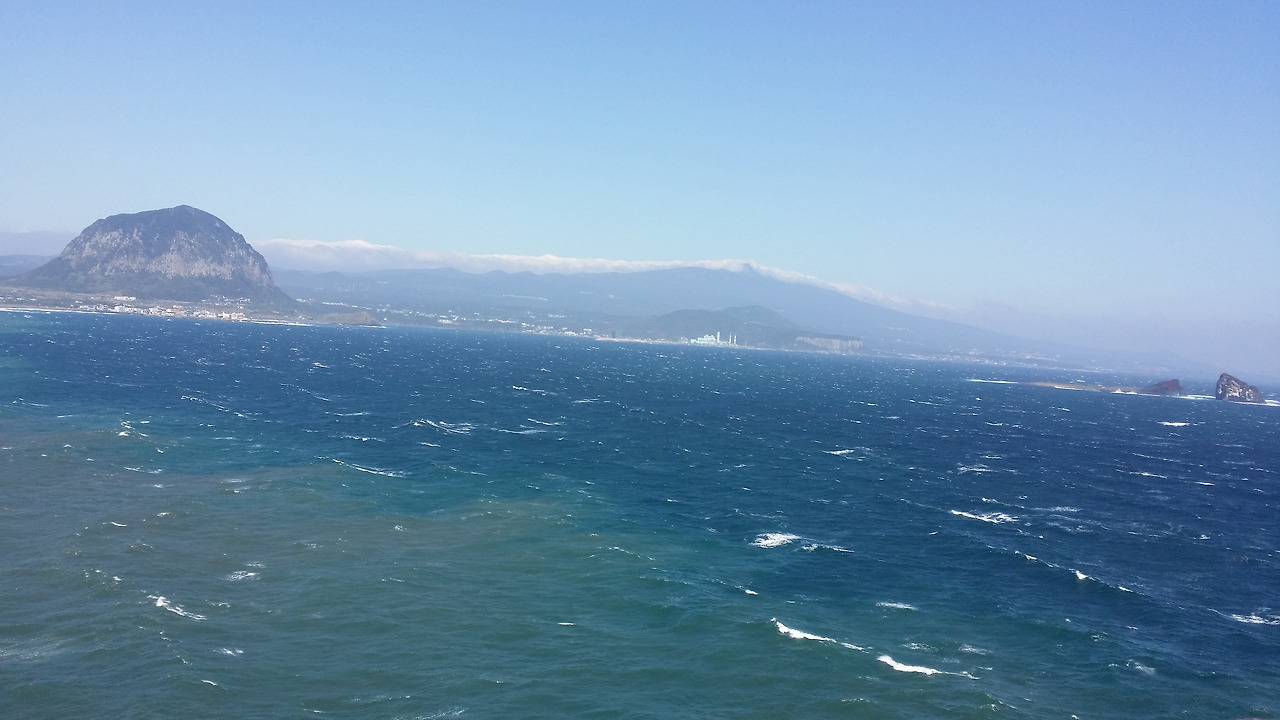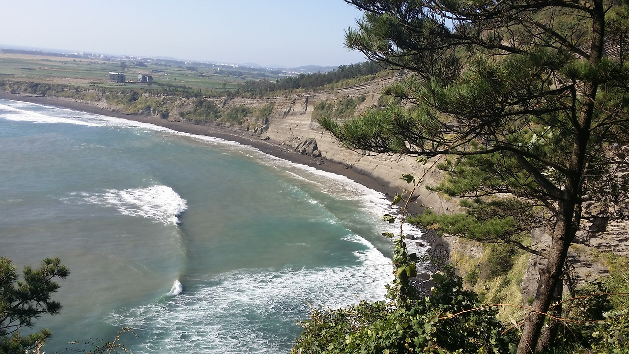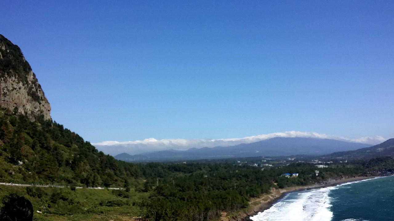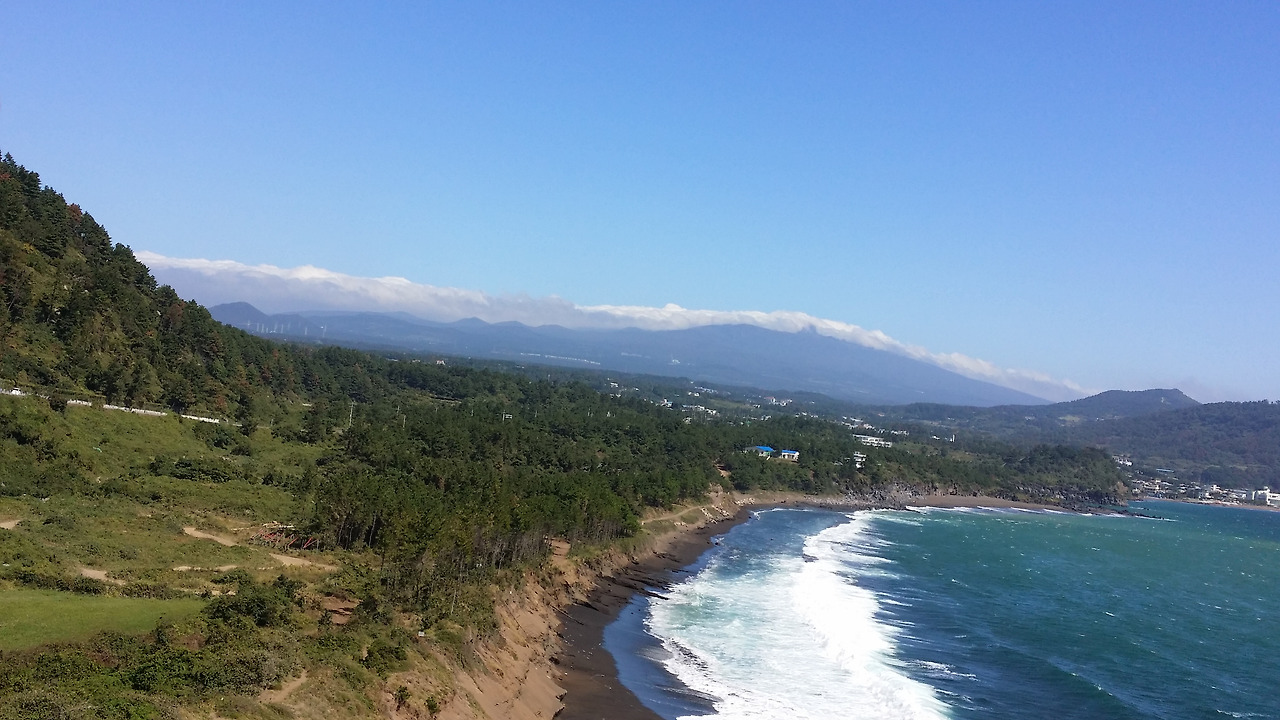 멀리 뒤편으로 지나온 길들이 눈에 들어온다. 거센 파도가 점점 더 강해지고 있다. 태풍 봉퐁의 영향이라 그런가 그칠 기미가 없다. 그 길을 가다 산방산에 들어섰다. 산에 동굴이 있어 산방산이라 했다는데 그 의미를 잘 모르겠다. 바람과 태풍으로 해안 풍경을 감상할 기회를 잃었다.