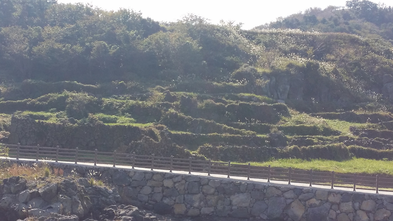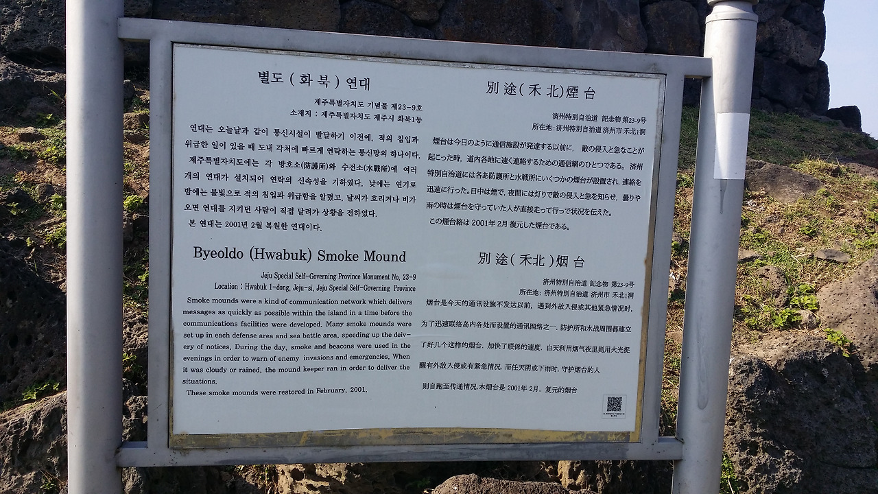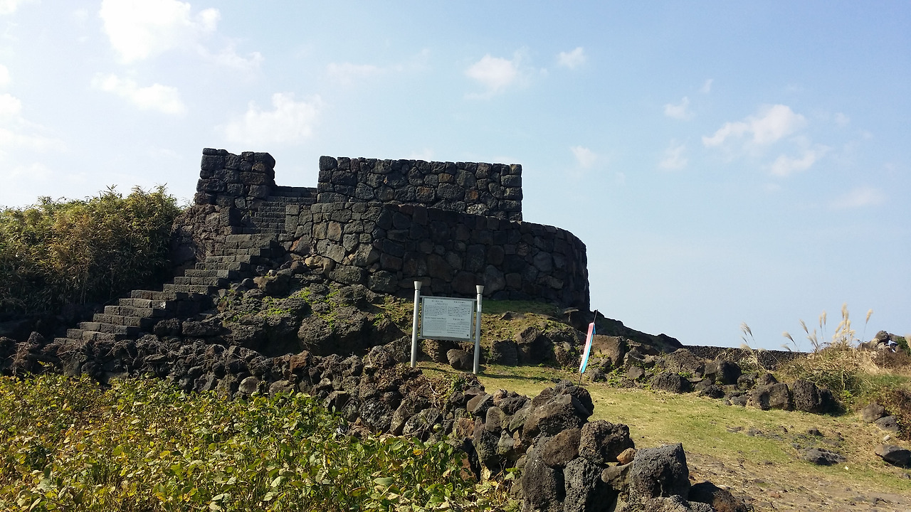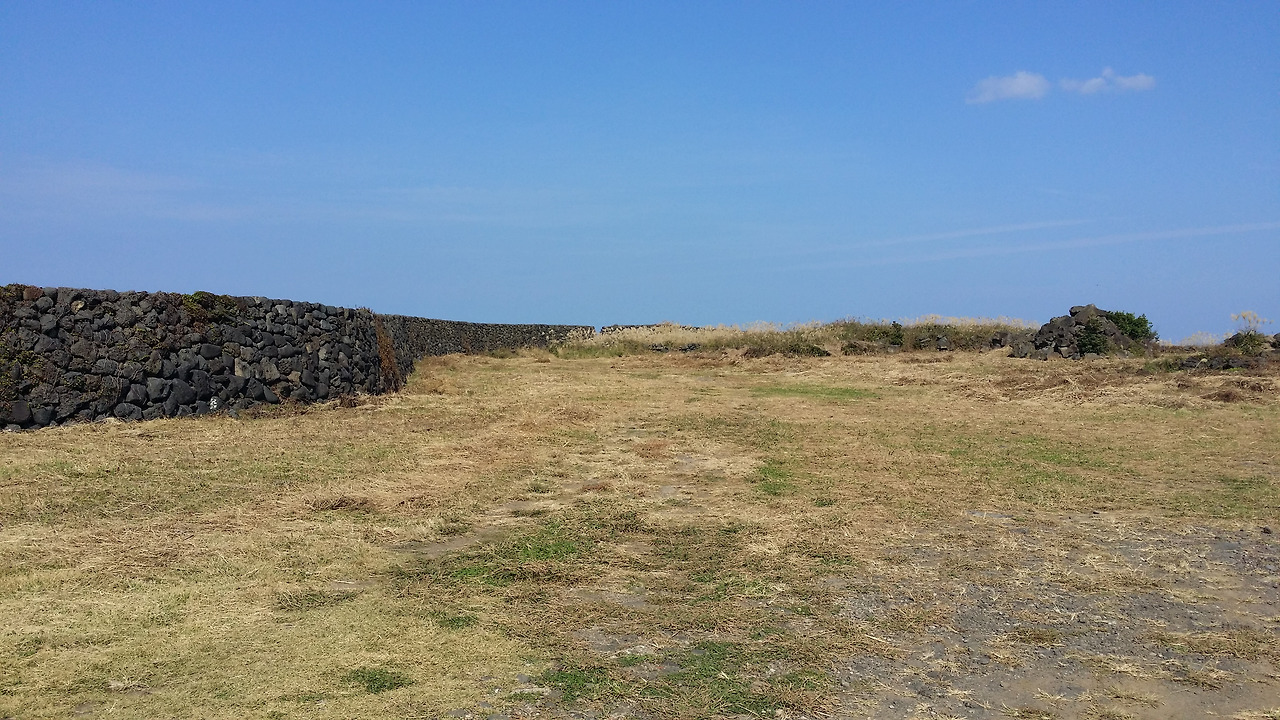 갑지가 넓은 풀밭과 해안선을 향해 쌓아 올린 산성 같은 돌담이 앞길에 턱 하니 나타났다. 환해산성이라고 했던가. 이름은 기억나지 않지만 꽤 길게 해안선을 향해 철책마냥 쌓아 올려 있었다. 아마도 옛적 군사적으로 방어하기 위한 역할을 하고 있었을 것이다. 그 끝자락에 화북연대라는 봉수대 같은 돌로 쌓은 단을 보니 연결점이 있다는 생각이 들었다. 화북연대를 지나니 갑자기 시간에 쫓긴다. 3시까지는 사무실에 가야 하는데 벌써 2시다. 하긴 워낙 늦게 일어나서 걷기를 시작했으니 벌써 2시라는 게 내가 몰두했다기보다는 게으름의 소치인 것을 인정해야 한다.