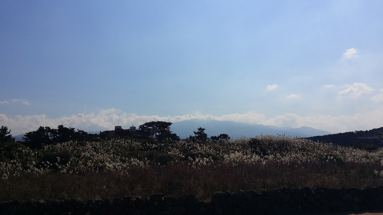 그 와중에 한라산은 자신의 일정을 소화하고 있다. 제주에 와서 걷거나 야외에 나가 있으면 몇몇 군데를 제외하고는 어디서든 한라산을 볼 수 있다. 한라산은 언제나 구름을 턱 걸친 재 자신의 맑은 미소를 내보이는 날이 적다. 오늘도 화창하기 그지없는 날씨임에도 지 혼자만 정상 부근에 뿌연 구름을 잔뜩 걸치고 자태를 보여주지 않는다. 징한 녀석... 그래도 갈대와 숲과 한라산이 어우러지는 모습은 참 놓치기 아까운 모습이기도 하다.