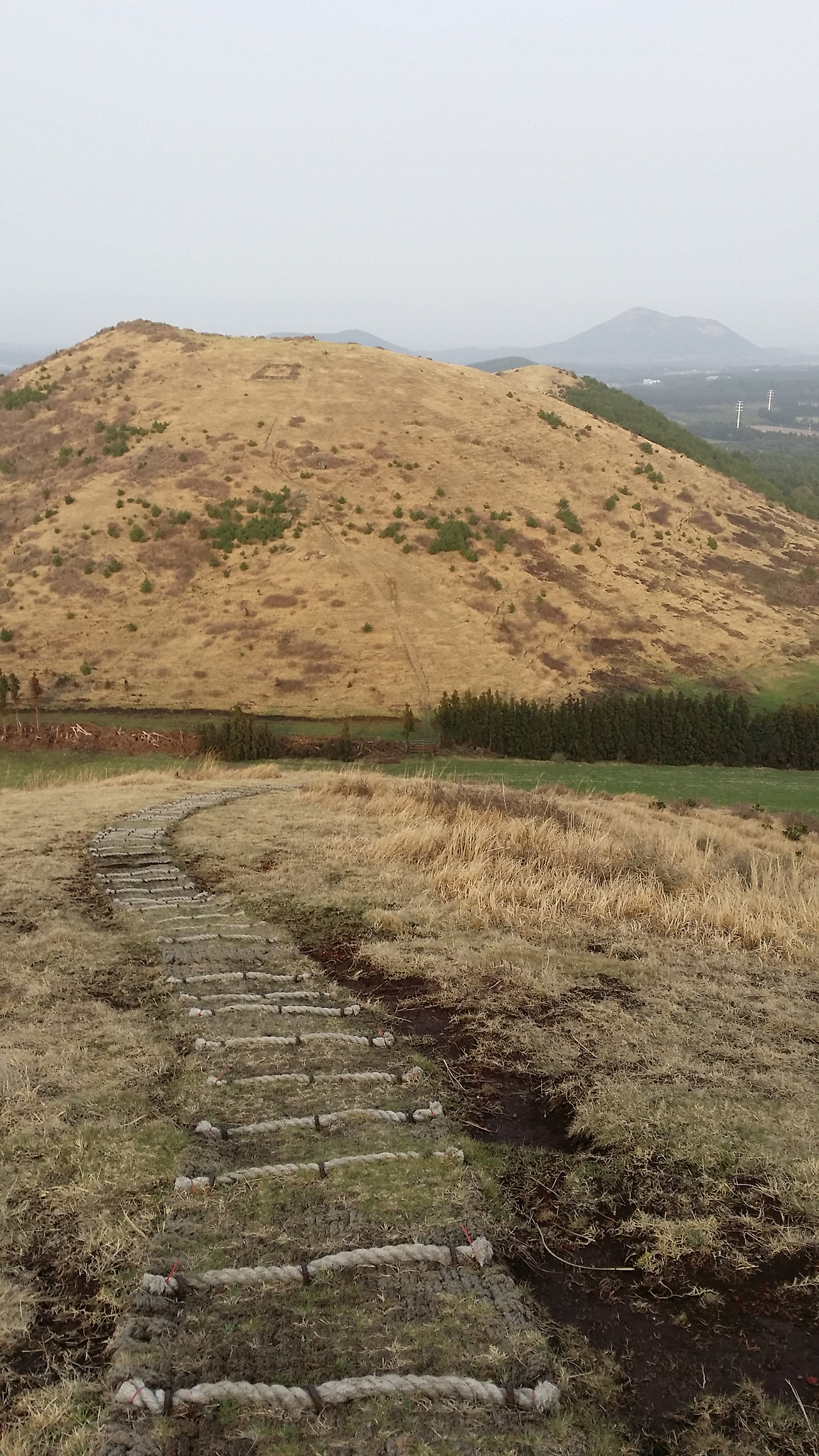 오름 정상을 넘어 다시 급격한 내리막이다. 바로 옆에 붙은 오름으로 이어지는 길이 시야를 이끈다. 옆 봉우리가 밧돌 오름이다. 두 곳이 형제라도 되는 듯하다.