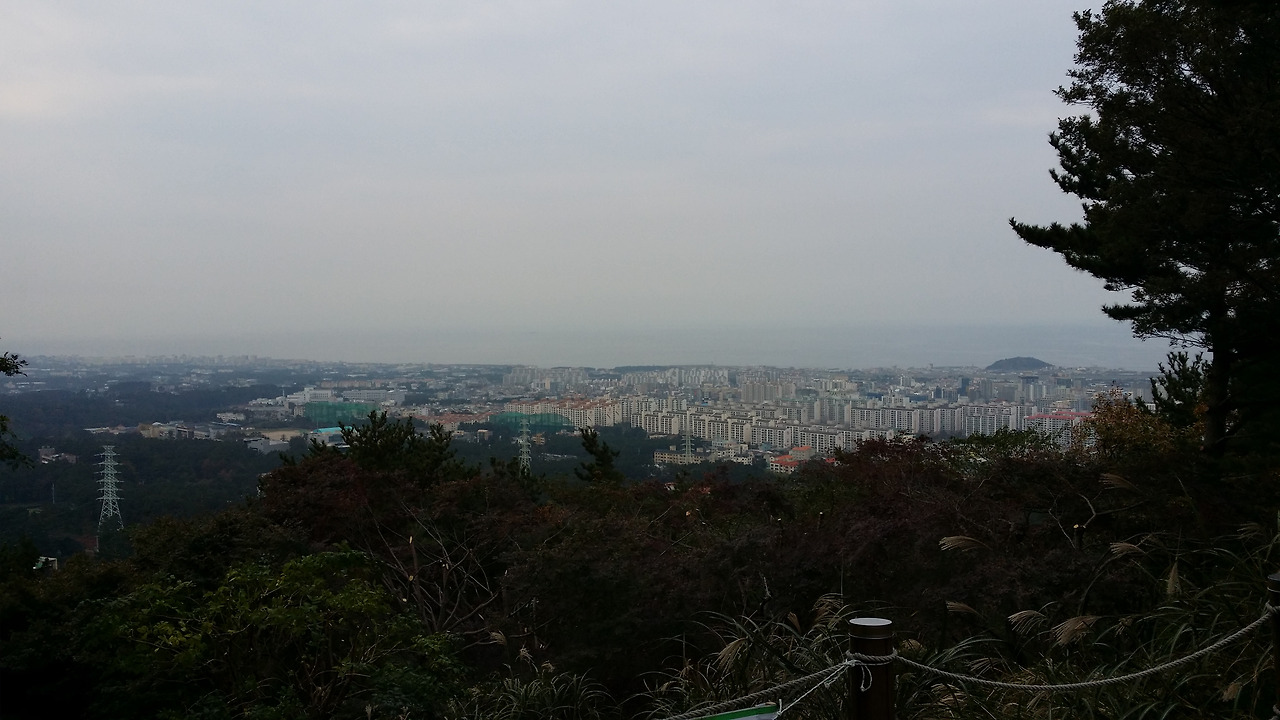 푹신한 오르막을 천천히 걸으며 정상을 향했다. 한라수목원의 정상은 광이오름이다. 제주의 모든 언덕은 모두 오름이라 해도 과언이 아니다. 이곳 역시 육지의 느낌하고는 역시 다른 무엇이 있다. 산책길로는 참 좋은 곳이다. 힘들지도 않고 길지도 않다. 오르니 제주시의 북쪽 앞바다가 탁 트이게 보인다 앞쪽의 봉우리가 도두봉이 분명하다 그 앞에 공항이 있는 걸 보니... 지난번 도두항을 지나 꼭대기에서 바라보던 공항이 저곳이구나 싶다. 왼쪽으로도 많은 아파트가 보인다. 제주도 꽤 많은 아파트가 지어지고 있다. 저 봉우리 더 왼편은 이호 태우 해변 이리니... 뿌연 제주 바다를 보며 사람이 그리워지는 것은 당연한 일이라 하겠다.
