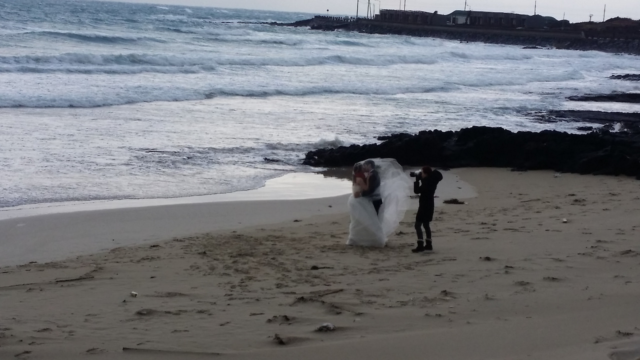 해변에서 신호부부 사진을 촬영 중이다. 무진장 추워 보인다. 둘이 키스하는 장면을 찍고 있는데 이 추운 겨울에 신부가 민소매의 옷을 입고 있으니 추워 죽으라는 소리다. 암튼 재미있다. 사진은 멋지게 나올 것 같다.
