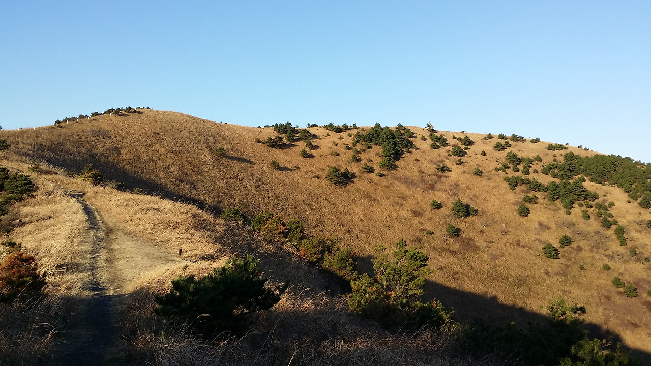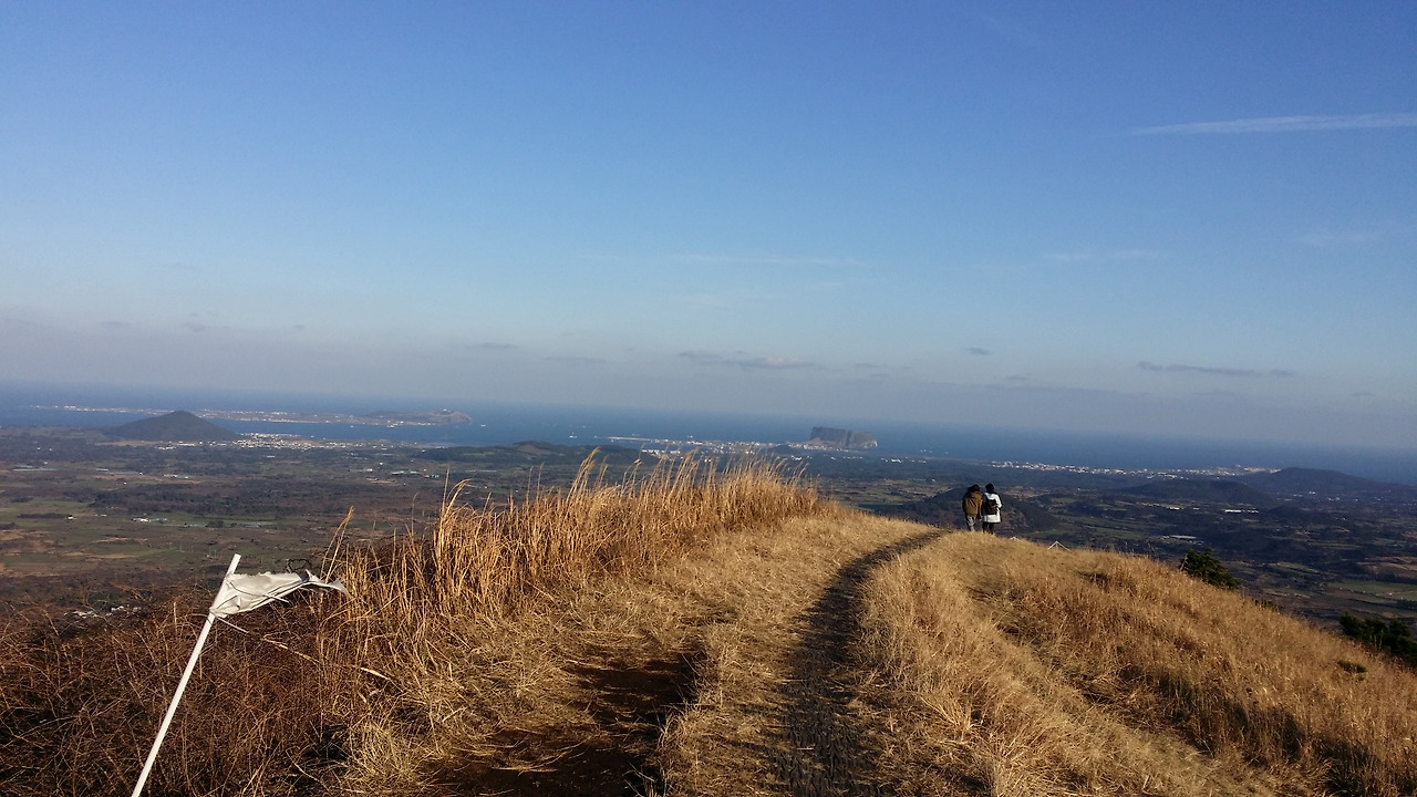별로 높지도 않은 이곳에 올라와 주위의 풍광을 감상하다가 내려오니 한 시간이 지났다. 벌써 해가 뉘웃거리며 제 갈길을 재촉하는 기분이 든다. 저 아래 동생 봉우리가 빨리 나를 찾아줘라며 계속 부르고 있다. 내려갈 시간이다. 바람도 약간은 잦아들 거라 생각하니 발길을 재촉하게 된다. 그래도 여전히 사방에 남겨둔 이 시원한 경치를 남겨두고 가기가 이렇게 아쉬울까 싶다. 지도에서는 여기가 바닷가와 이렇게 가까울 것이라고 생각 못했는데 멀리서 보니 그동안 내가 걸었던 곳이 다 지척이다. 제주의 동북사면을 다 본 느낌이다.