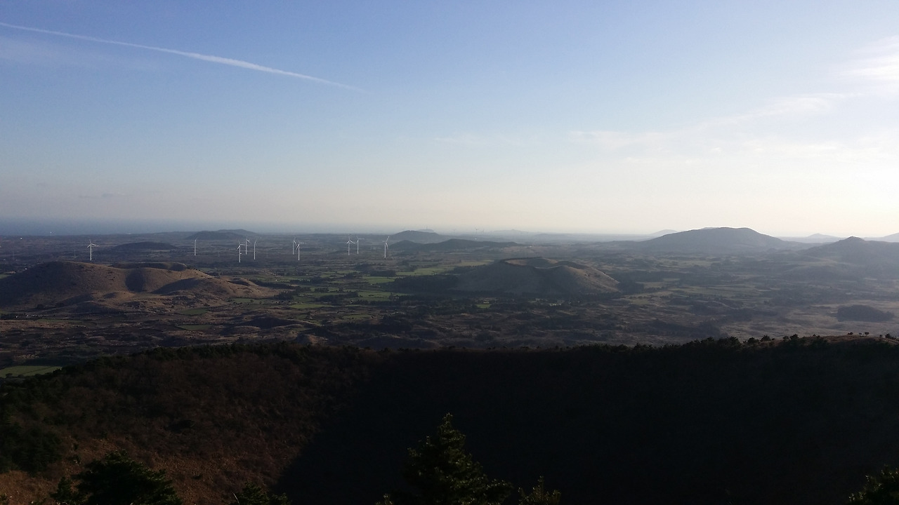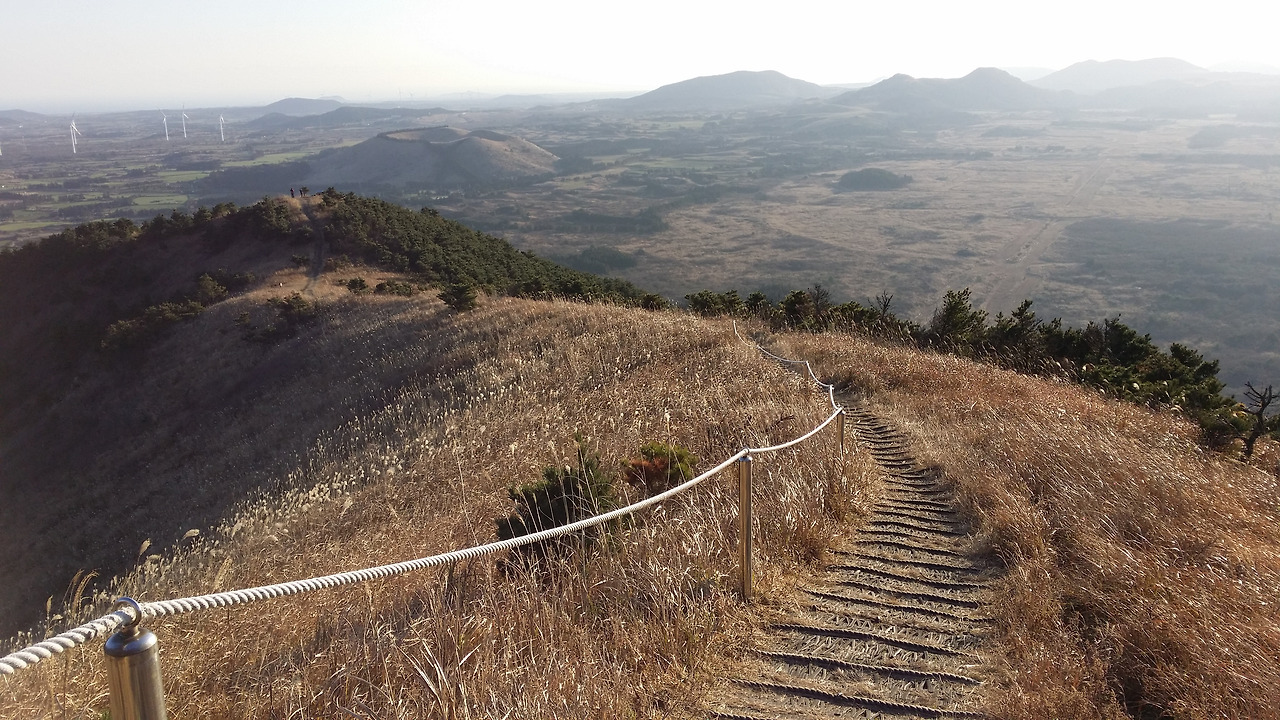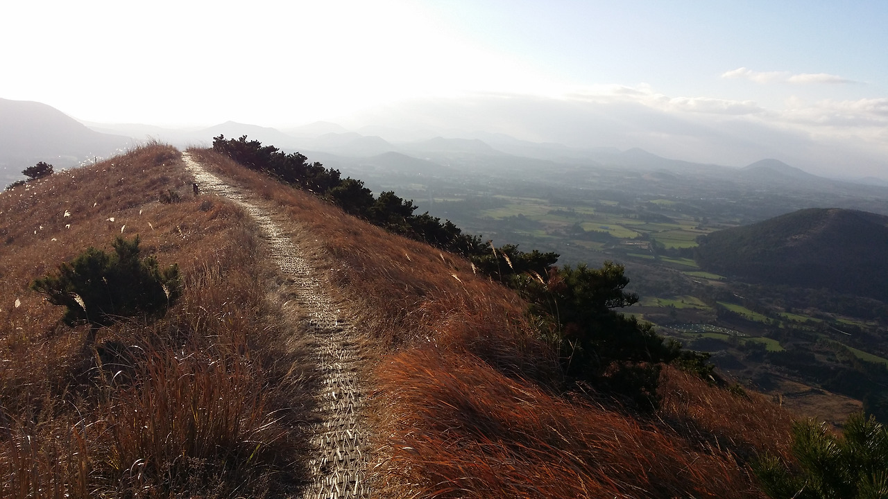 제주의 오름은 특이한 구석이 있다. 주변의 풍광을 한눈에 다 볼 수 있다. 육지의 다른 산들과 다른 풍경을 준다. 그냥 산과 다르다. 산은 주변의 언덕을 통해 오른다. 천천히 경사를 오르다. 험한 곳과 완만한 곳이 겹치면서 정상을 향한다. 강원도의 산들이 그렇다. 첩첩산중이라는 말이 어울린다. 산과 산이 겹쳐 있으니 주변에는 산이 보인다. 굽이굽이를 넘어 저 아래의 마을이 보이는 것이 정상적이거나 아주 자연스럽다. 제주의 오름에서 보는 풍경은 그것과 사뭇 다르다. 그래서 사람들은 이국적인 느낌을 갖거나 낯선 풍경을 경험하게 된다.