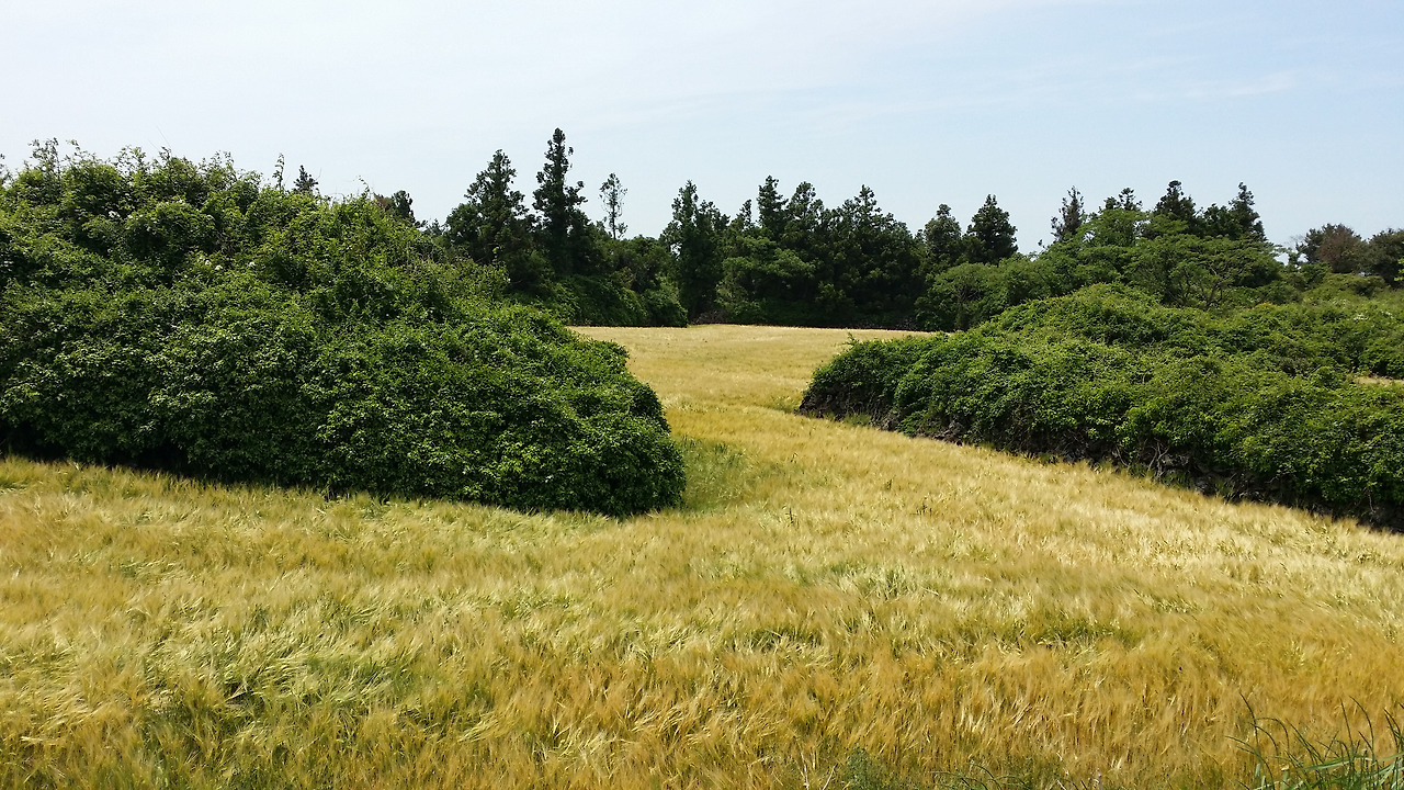 한참을 걷다 재미있는 풍경을 만났다. 보리밭 사이사이로 바위나 흙덩어리들이 띄엄띄엄하게 놓여있다. 자세히 보니 바람에 흔들리는 보리밭 사이를 이 바위들이 사사삭 소리를 내면서 움직이는 모습이다. 한두 개의 바위 덩어리가 아니라 10개는 족히 넘을 바위들이 위에는 온갖 풀과 잡목들을 뒤집어쓴 채 조금씩 움직이고 있다. 바위섬이 보리밭을 수영한다.