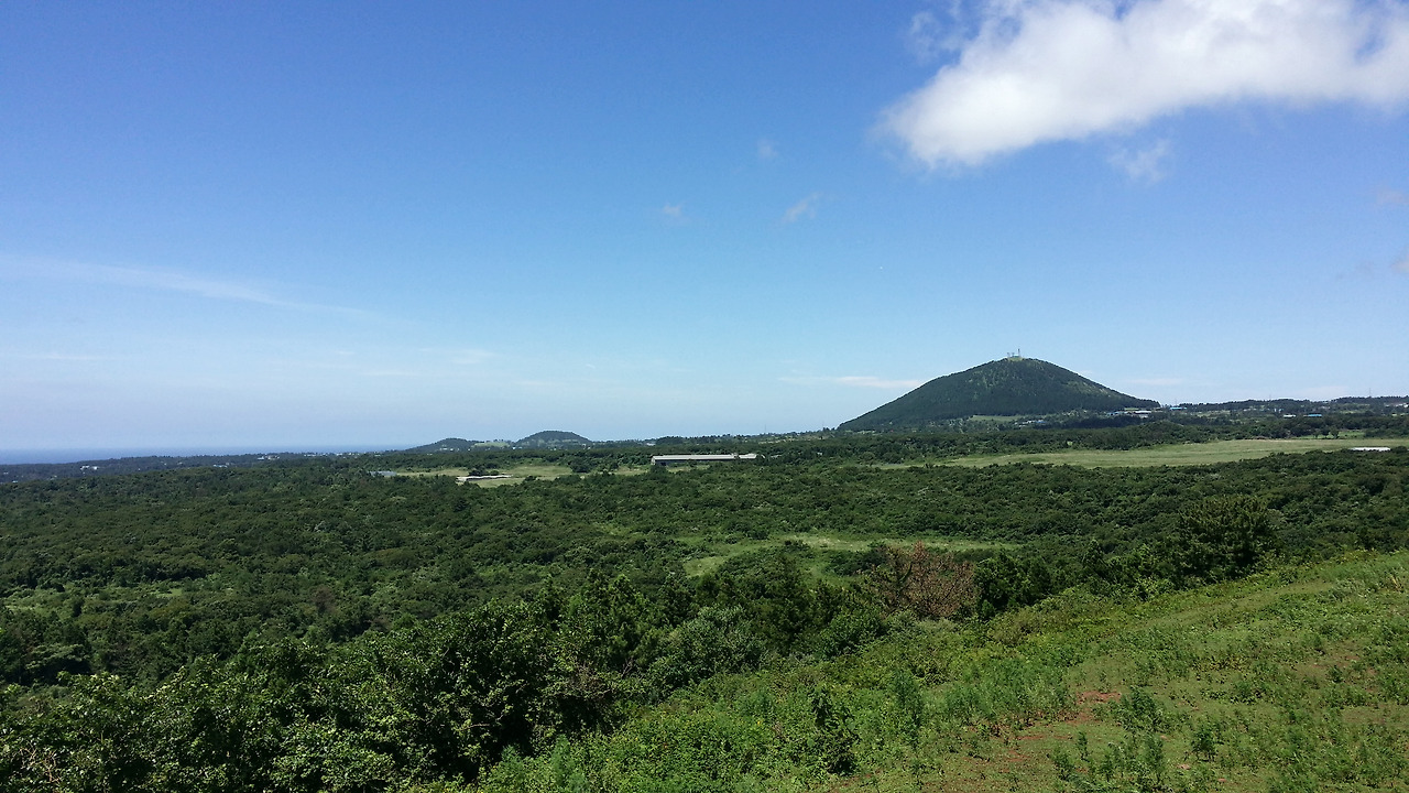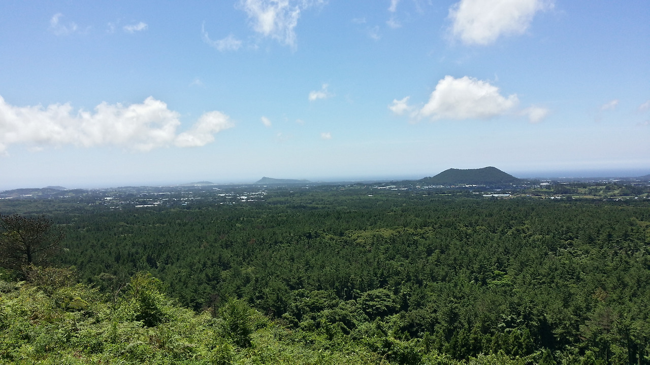 정상에서 보는 청수곶자왈과 반대편 숲 속은 제주가 마치 아마존의 원시림이라도 되는 양 그지없이 푸르른 느낌의 출렁이는 숲이 펼쳐진다