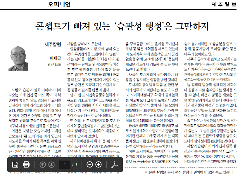 제주가 급격하게 변하고 도시화되는 추세를 막기란 어려운 일이다. 그것을 막아야 하는지 여부와 별개로 도시 계획이라는 것이 기존의 무분별한 흐름을 뒤따라가기만 한다면 도시의 컨셉과 색깔을 기대하기는 어렵다.