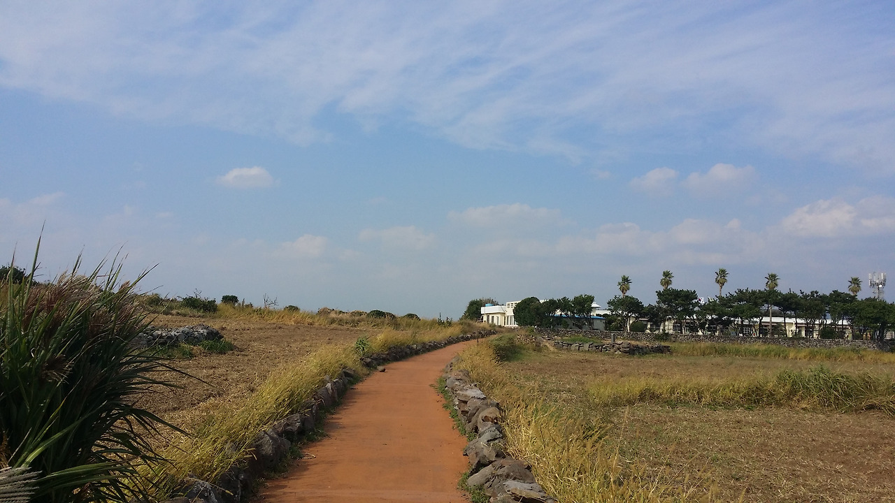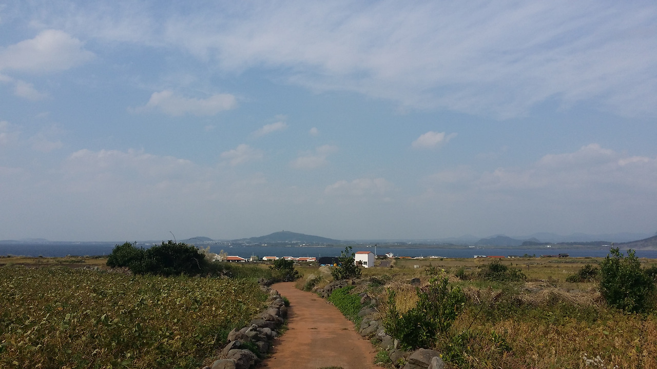 아... 이 너른 장소에 보리를 심으면 봄에는 청보리가 바람에 흩날리겠구나. 아스라한 그리움이 벌써부터 가슴에 와 닿는다. 봄에 이곳에 와야 할 이유가 생겼다. 지금도 이처럼 시원한데 청보리가 바람에 살랑거리면 얼마나 이쁘려나... 그러면 온 섬이 몸살을 앓을 것이고 수익도 꽤 오를 것은 자명한 일이다. 그만큼 매력적인 평지와 다시 배를 내렸던 곳을 향해 내리막이 나타났다. 보리를 대신해 콩이 심어있지만 역시 그 보리밭 사이, 아니 콩밭 사이로 펼쳐진 바다와 멀리 송악산과 산방산은 더할 나위 없이 아름다운 자태이자 그리움의 상징이 되기도 하리라.