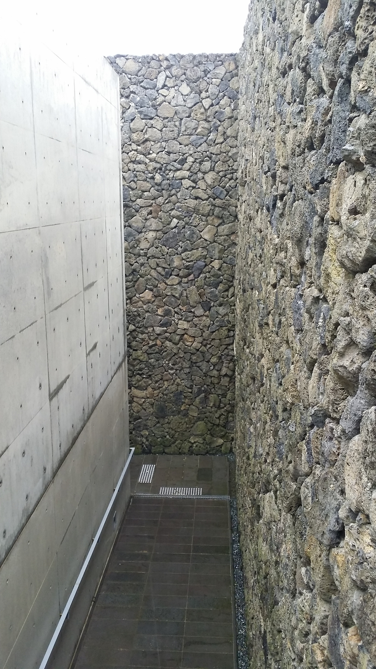 비가 오는 중에 물에 젖은 콘크리도 외벽과 양쪽에서 내리는 물을 지나는 기분은 다른 세계로 내려가는 입구라는 인식을 더 강하게 심어준다. 아마도 건축가가 의도한 것도 이것이었으리라. '지금부터 당신이 걷는 길은 이승을 지나 다른 차원의 어딘가로 가고 있다'고 인위적인 메시지를 주고 있다.