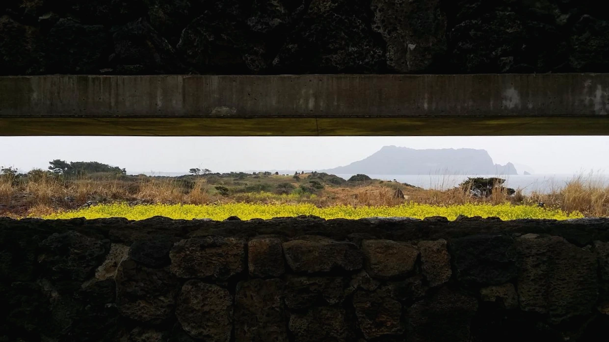 첫 번째 도구는 입구에서 가로로 길게 벽을 뚫고 보여준 성산일출봉과 바다의 모습이다. 눈높이에 어울리도록 만들어 놓은 풍경을 통해 마치 풍경이 내가 존재한 이곳의 모습과 다른 세상의 모습임을 암시하도록 하고 있다. 익히 아는 풍경이기는 하지만 인위적인 사각의 틀을 통해 들여다보게 함으로써 보는 이를 풍경과 격리시켰다. 이 세상의 익숙한 경치를 동떨어진 곳에서 바라보는 격리 효과를 적절하게 배치했다. 저 경치를 보면서 무언가를 느길 수 있는 준비를 하도록 해준다.