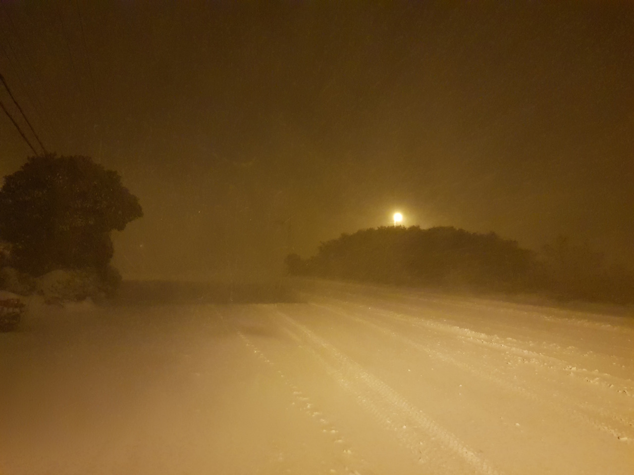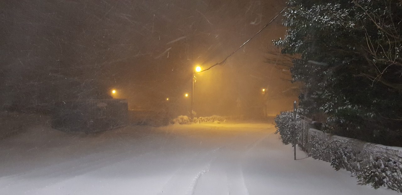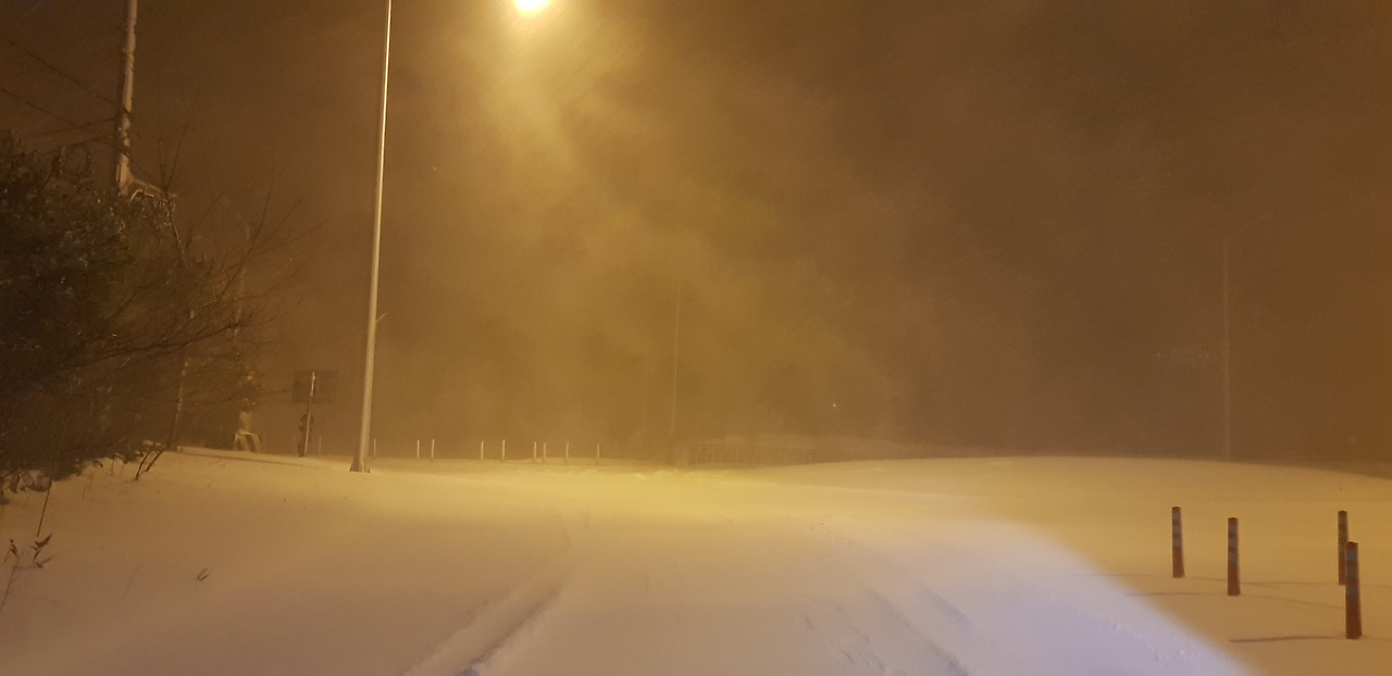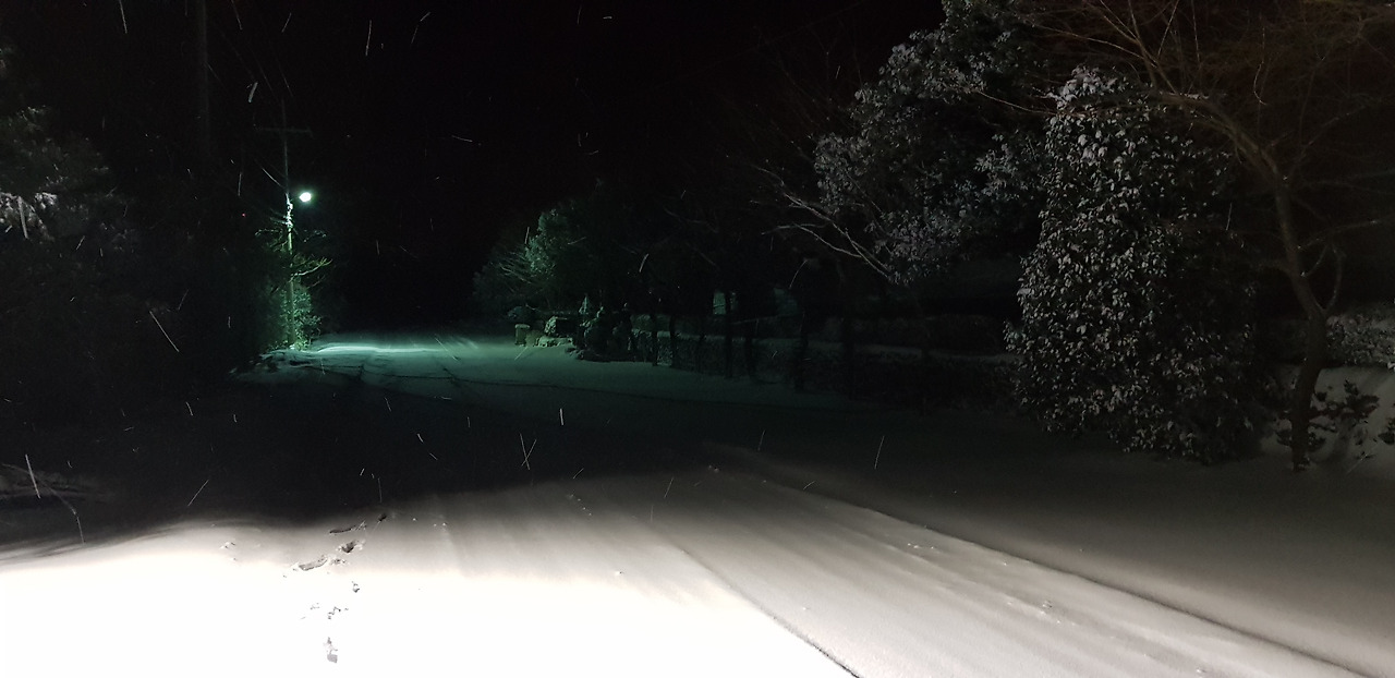버스 운전사는 놀라울 정도로 속도를 내며 눈길을 운전한다. 결코 차량이 더 진행할 것 같지 않은데 차선이 없어진 채 10~20cm 이상은 족히 쌓여있는 눈길을 아슬아슬하게 운전한다. 운전실력이 놀랍다. 운전사는 자신도 걱정스러운지 조심하지만 속도가 줄어들고 있다는 생각이 들지는 않는다. 언덕을 오르는 길에는 역시 힘겨워보인다. 송당을 지난 덕천 방향으로 가니 이미 길에는 아무것도 없고 황량한 눈보라로 밤하늘과 거리가 묘한 색깔을 보여준다. 레트로 칼라라고 할까. 색 바랜 사진 같은 밤길의 모습이 보인다. 깜깜해야 하는데 눈으로 야기된 흰색이 어둠을 완화시켜주고 띄엄띄엄 켜져 있는 가로등으로 색이 변해있다. 그 앞에 눈보라가 거센 바람과 함께 몰아치니 앞의 길도 불분명하다. 이 길을 운전하다니 놀랍다.