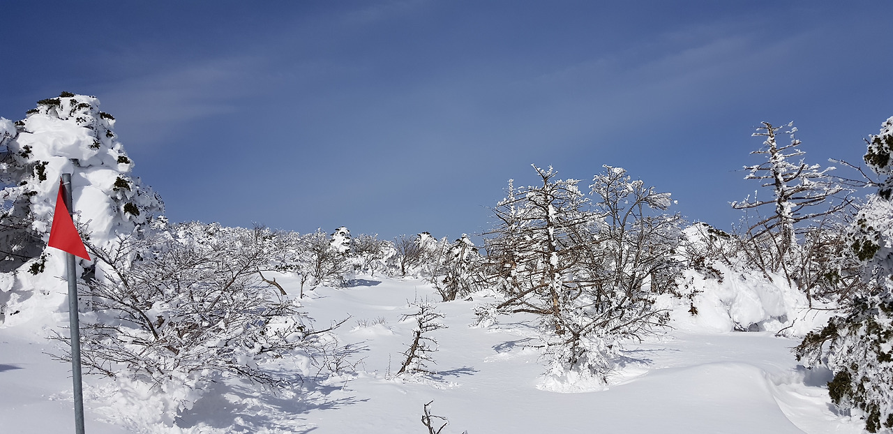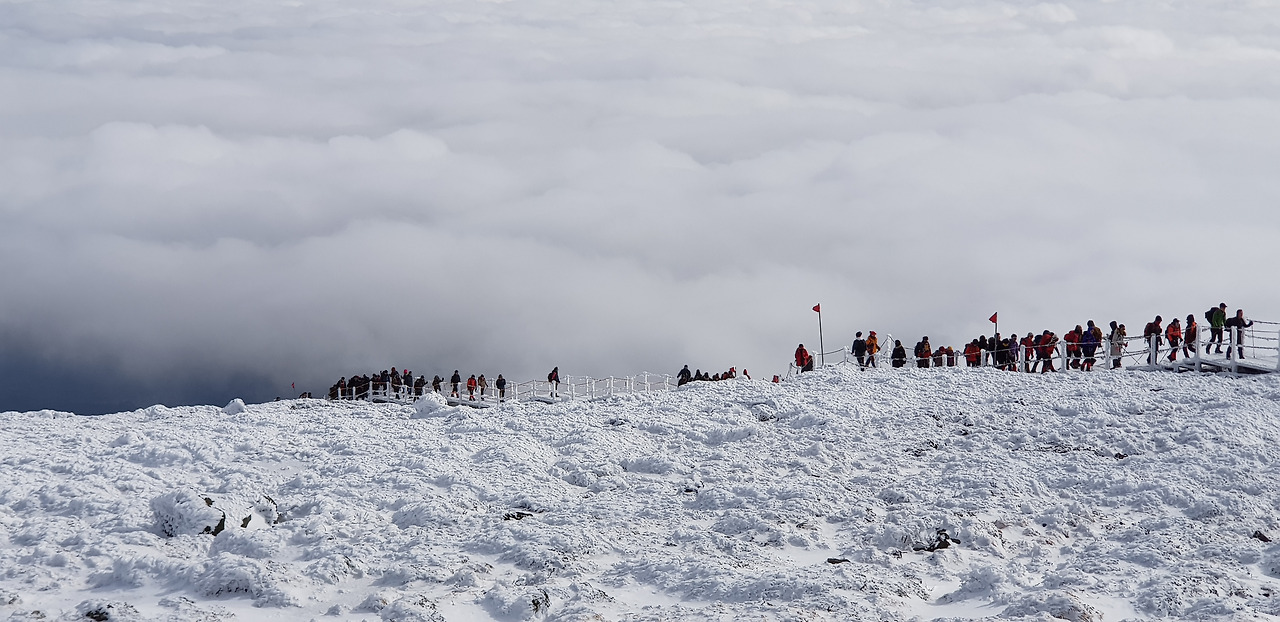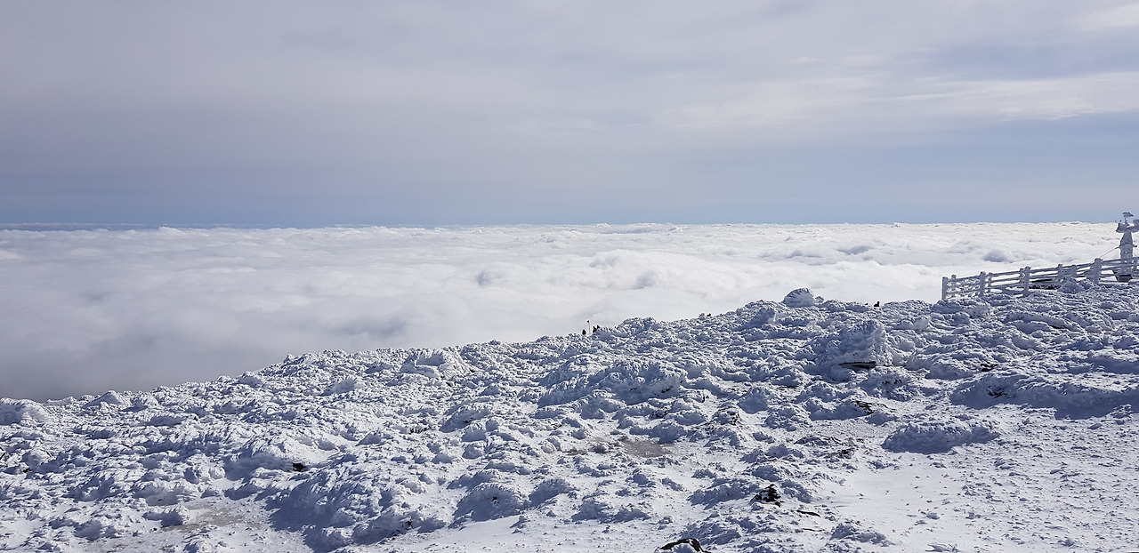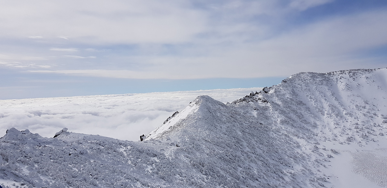 정상에 가까워질수록 나무도 없고 낮은 관목이나 돌에 눈이 쌓이고 거센 바람에 눈발이 날린다