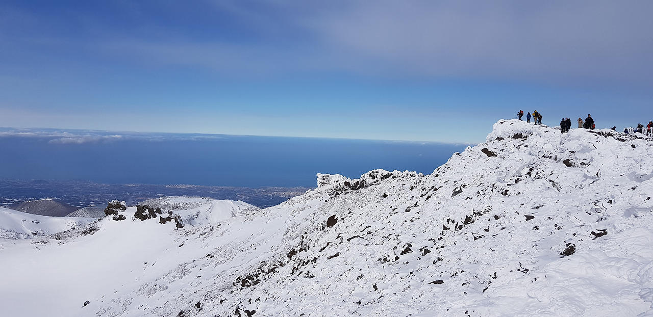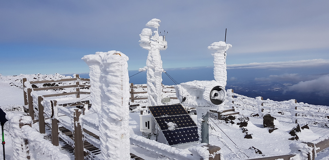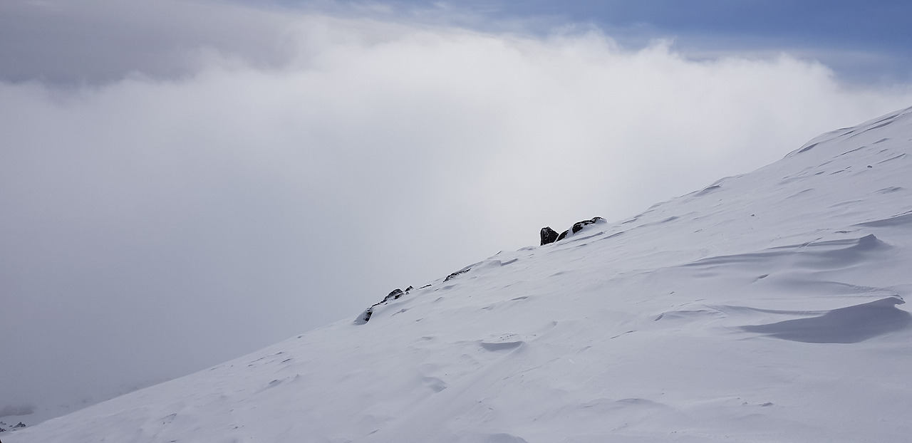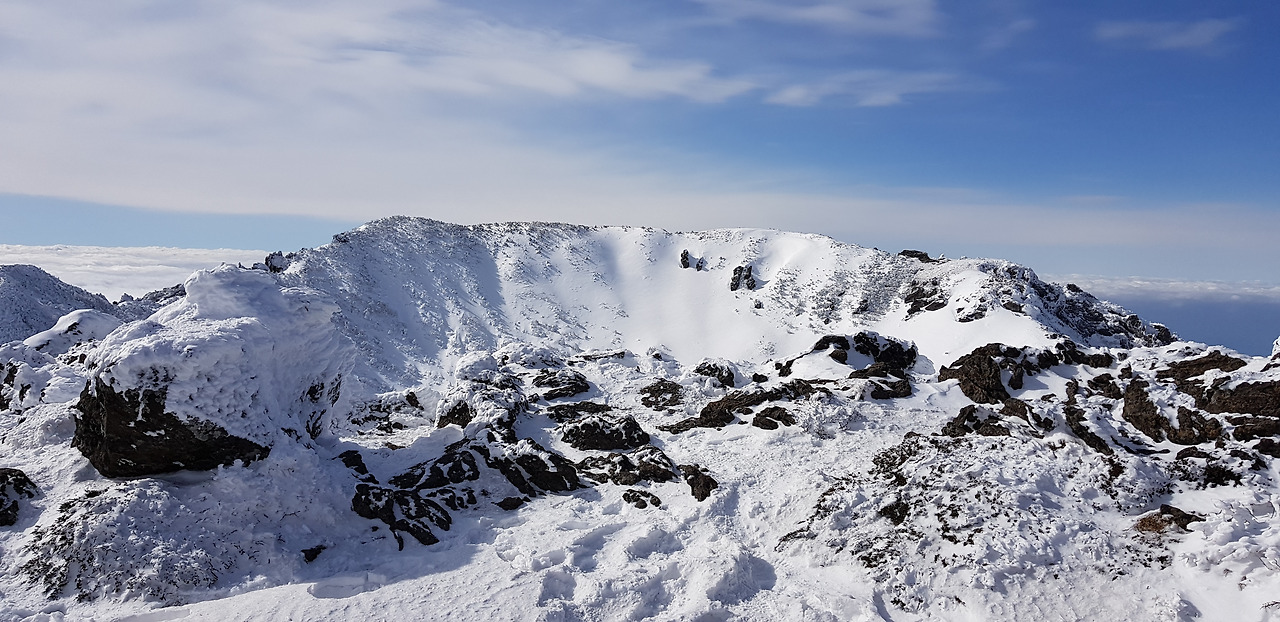 정상에 가까워질수록 나무도 없고 낮은 관목이나 돌에 눈이 쌓이고 거센 바람에 눈발이 날린다