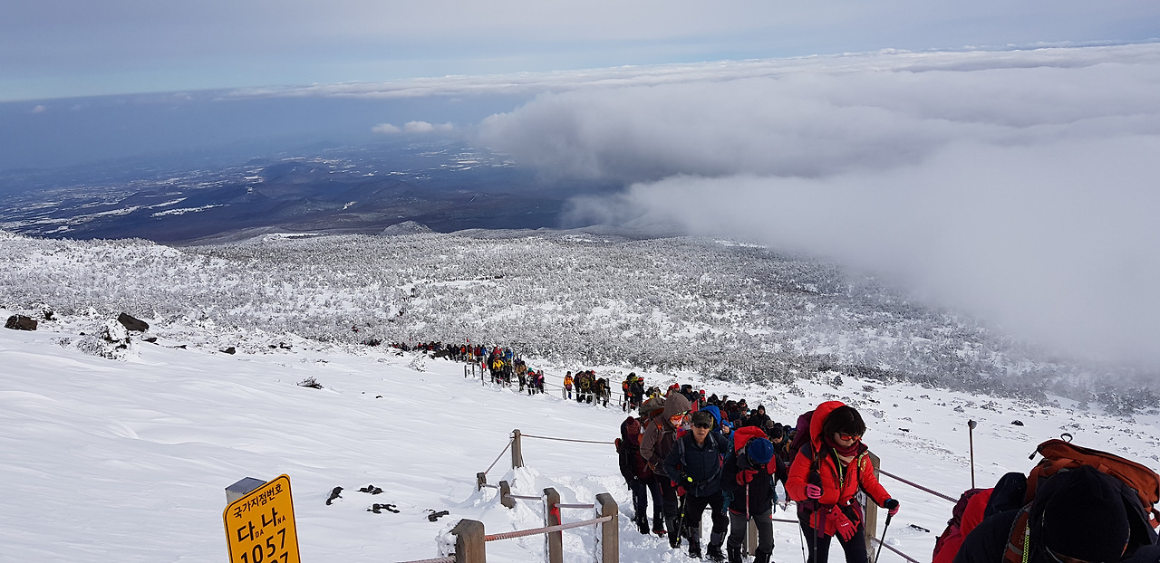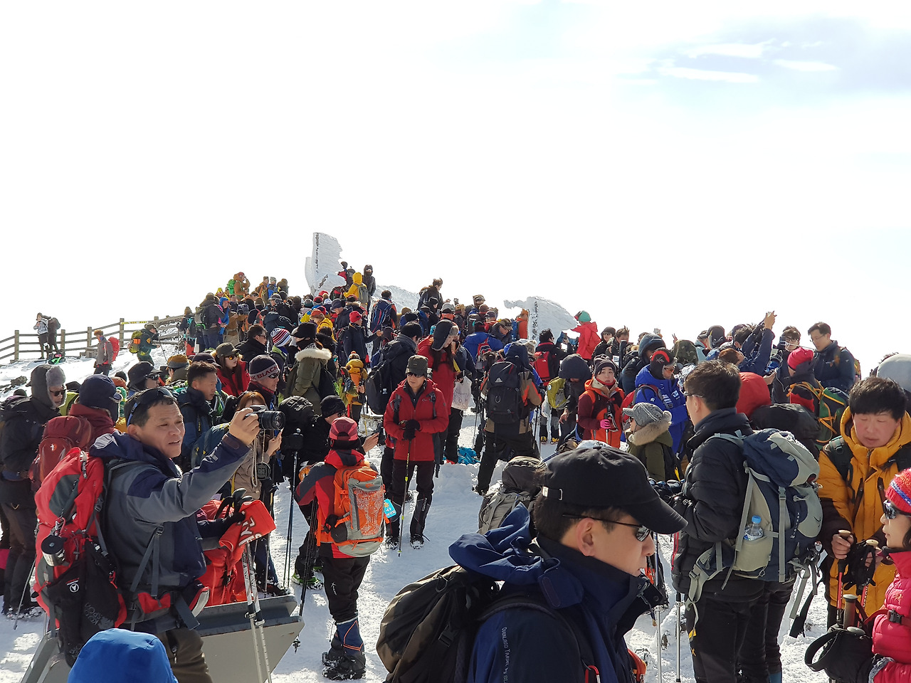 사람들은 지칠 만도 한데 정상이 코앞이라는 기대 때문인지 도무지 힘들어하는 내색을 하는 이들이 없다. 오늘 하루를 얼마나 기다렸던 것일까. 나야 갑자기 결정한 산행이지만 결정할 때 결코 오늘이 아니면 후회막급일 것이라는 생각이었다. 다른 사람들도 이 풍경의 의미를 알기에 복잡하고 힘든 과정이지만 선뜻 한라산으로 나선 것이리라. 멀리 비행기를 타고 내려오고 관광버스를 대절하면서 까지.