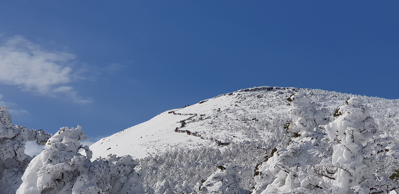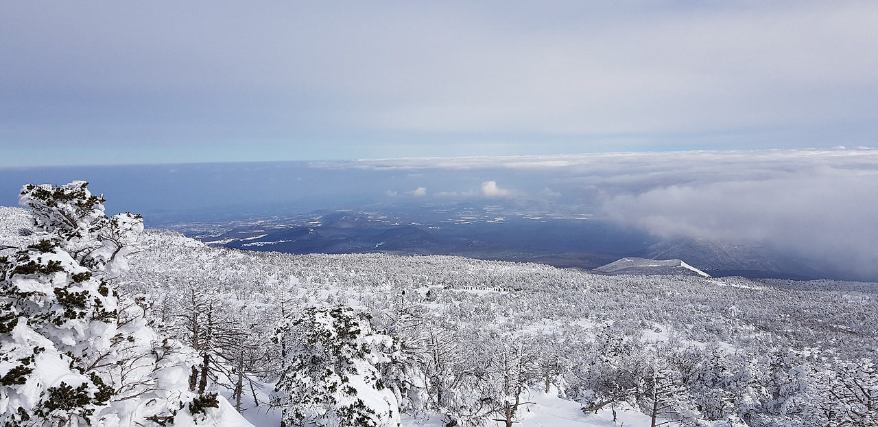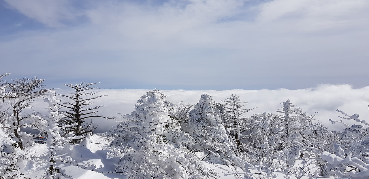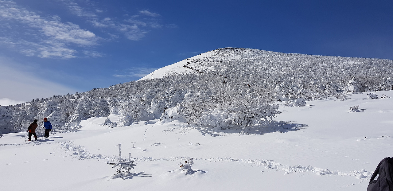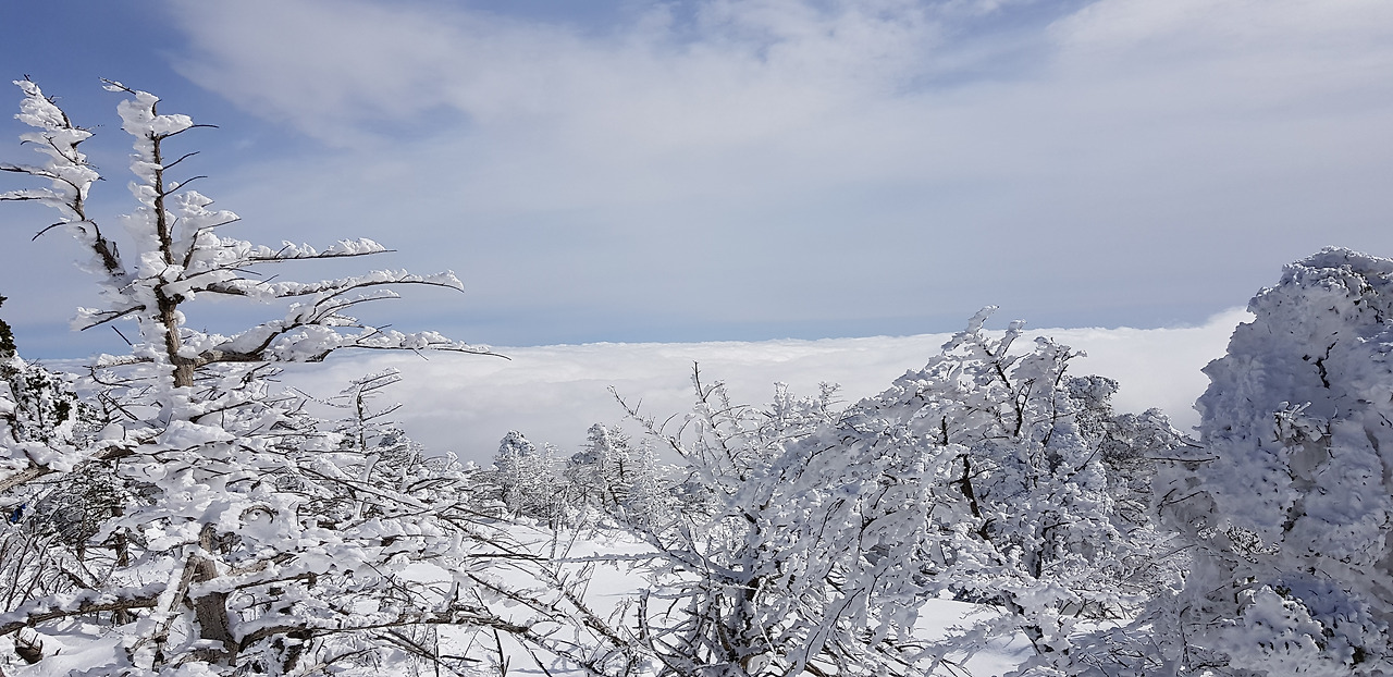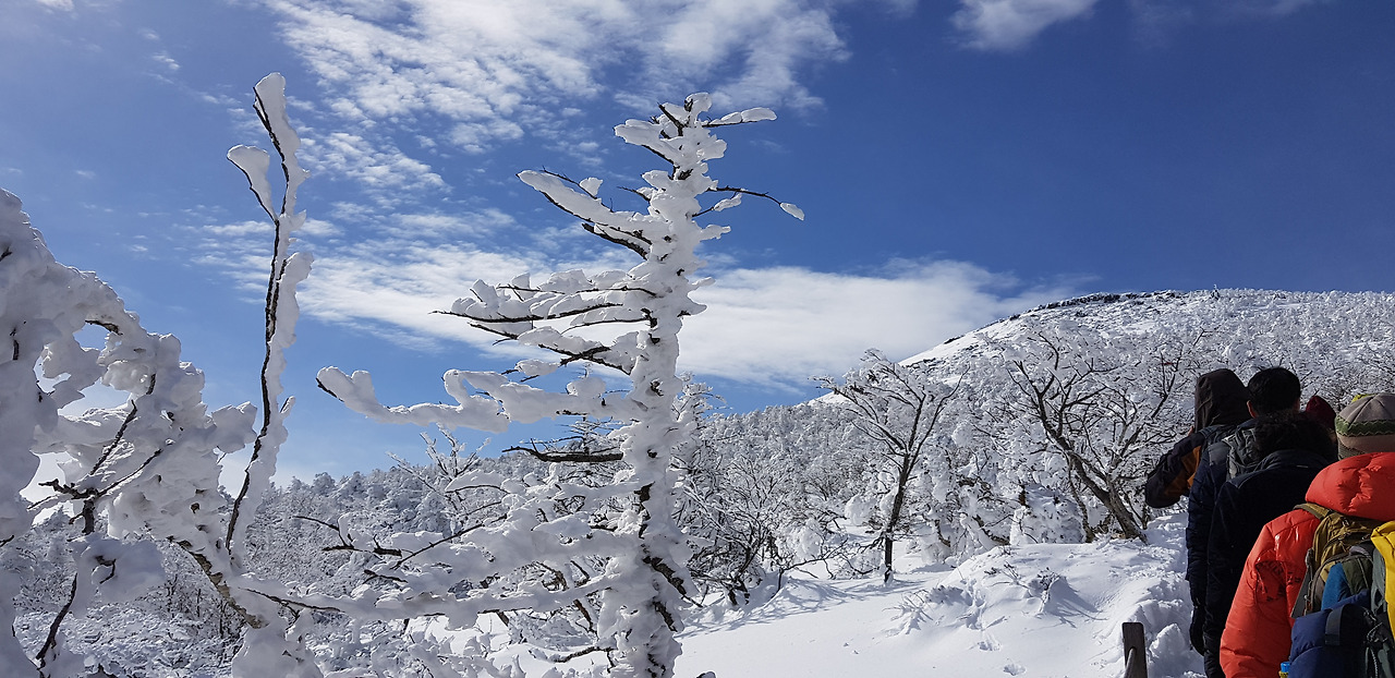 시간이 지나도록 배고픈지도 모르겠다. 앞사람을 따라 오른다. 간간히 뒤돌아 보면 눈 쌓인 나무와 오름 그리고 구름 등 다양한 풍경이 보인다. 앞으로 가다가 뒤돌아보기 쉽지 않다. 그래도 둘 다 놓치고 싶지 않다.