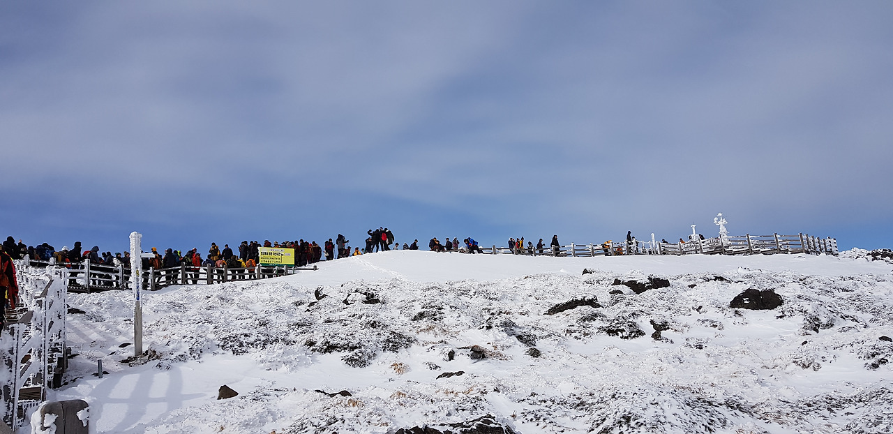 쉬엄쉬엄 오르는데 줄이 줄지 않는다. 가만히 보니 이미 정상인데 줄이 계속 정체되어 있다. 안 되겠다 싶어 옆으로 비켜서 정상을 오르니 마지막 줄은 정상을 향하는 줄이 아니다. 백록담이라는 돌 표지판에서 기념사진을 찍기 위한 줄이다. 소위 인증숏을 남겨 주변에 알리고 싶은 마음들 이리라. 얼마나 많은 인증숏이 인스타그램과 페이스북에 올라오려나... 나도 빠지지 않고 올려야지 결심한다.