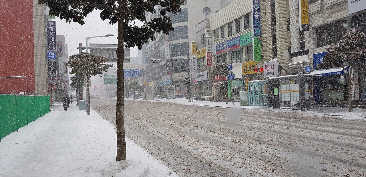 창밖 농촌의 풍경과 달리 시내에 도착한 모습은 마치 새로운 세상에 온 듯하다. 잠시 멈춘듯하던 도심에 눈발이 가차 없이 공격에 나섰다. 어찌 이 길을 그냥 정리하고자 하냐며 사정을 봐주지 않는다. 다니는 차량의 열기 덕분에 도로는 녹는 듯 쌓이는 듯 혼선이다. 지나는 버스와 트럭이 용감하고 맞설만하다.