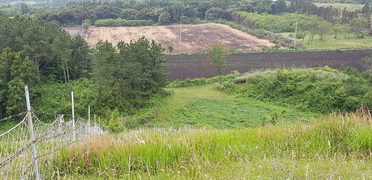 괜한 호기심이 생긴다. 평상시에 잘 다녀보지 않았으니 어떤 곳일지 모르는데 그래도 가보기로 했다. 송당에서 덕천으로 가는 길에 살짝 빠져 가다 보니 한적한 도로가 구불구불 드라이브 하기에 그지없이 좋다. 차들도 거의 보이지 않으니 한가로움을 느끼는 드라이브 코스다. 지도상의 오름 표시에도 어디가 입구인지 찾을 길이 없다. 근처를 왔다 갔다 반복하다 일단 오름으로 여겨지는 장소의 뒤편 쪽으로간다. 혹시나 하고 뒤편에 차를 세우고 한두 군데를 기웃거린다. 저기가 정상인 것을 알겠다. 철책은 아니지만 경게 담장이 그물로 쳐져있다. 그냥 밀고 올라가면 금새 오를 위치다. 근데 그러자고 온 것이 아니니 좀더 살펴보기로 한다.