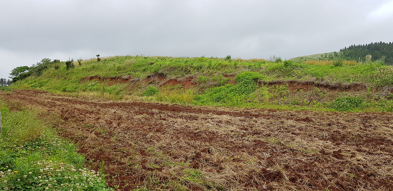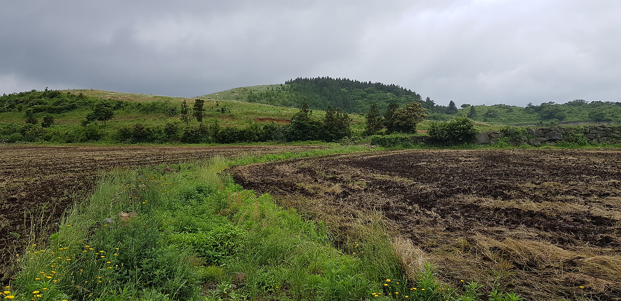 어렴풋하게 구부러진 모양이 오름이라고 말하기에 조금 민망한 수준이다. 바로 코밑까지 밭으로 덮여있다. 어딘가 요란한 트랙터 소리가 들린다. 밭을 갈고 있는 소리다. 오름의 앞으로 나와 천천히 걷는다. 오름으로 보이는 능선 정상 부근을 모두 밭으로 뒤덮고 있으니 오르는 길이 없는 게 당연하다.