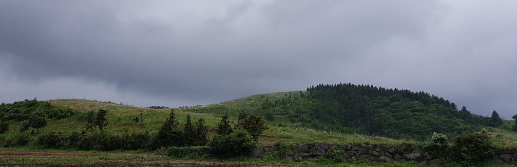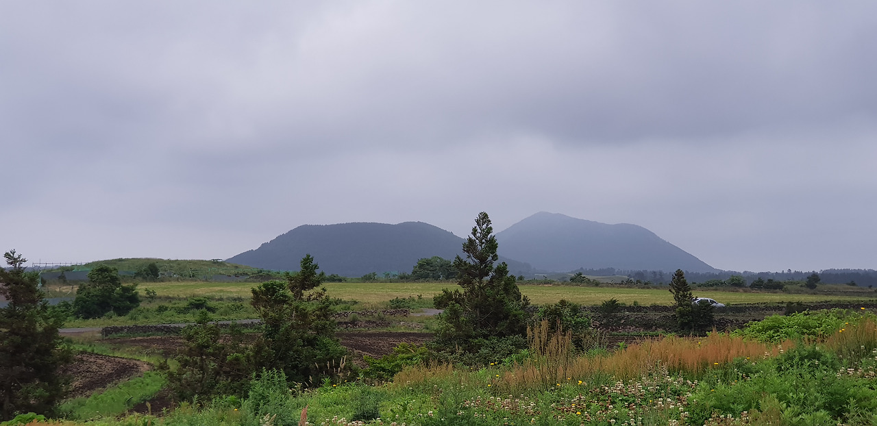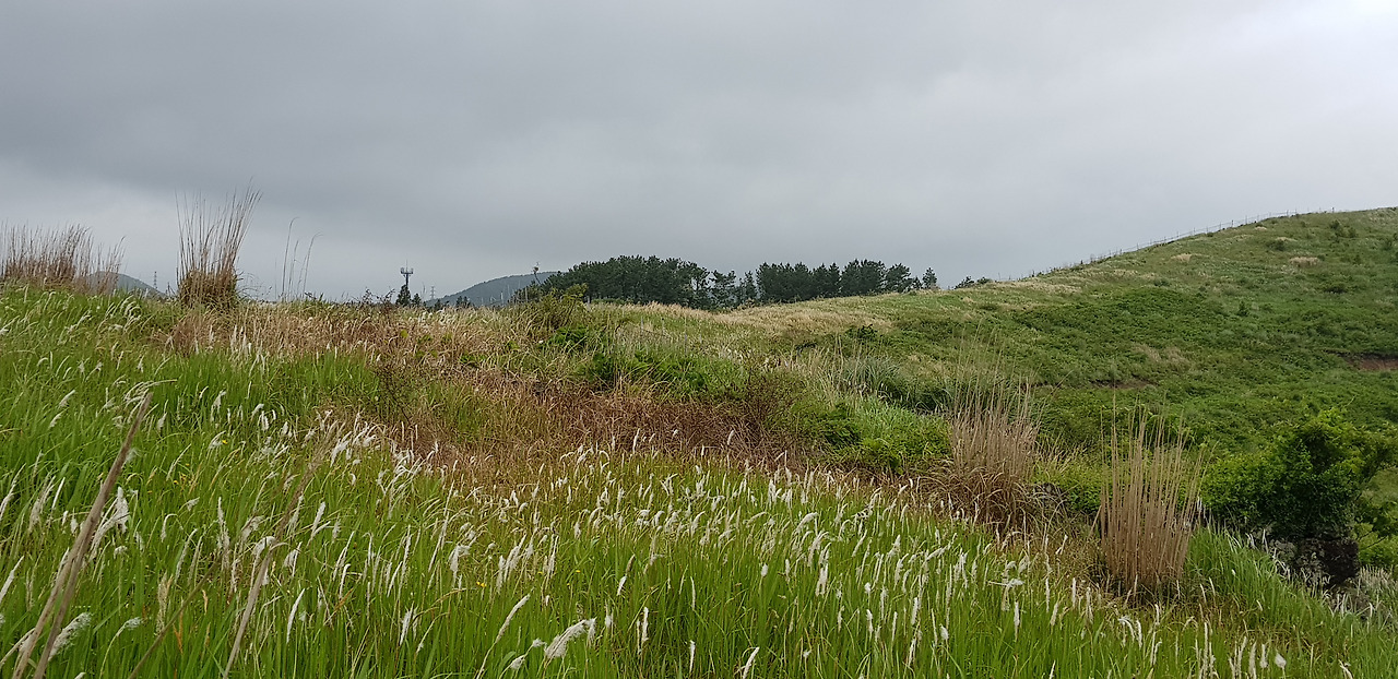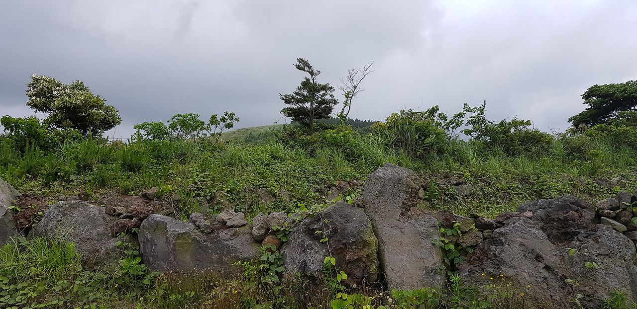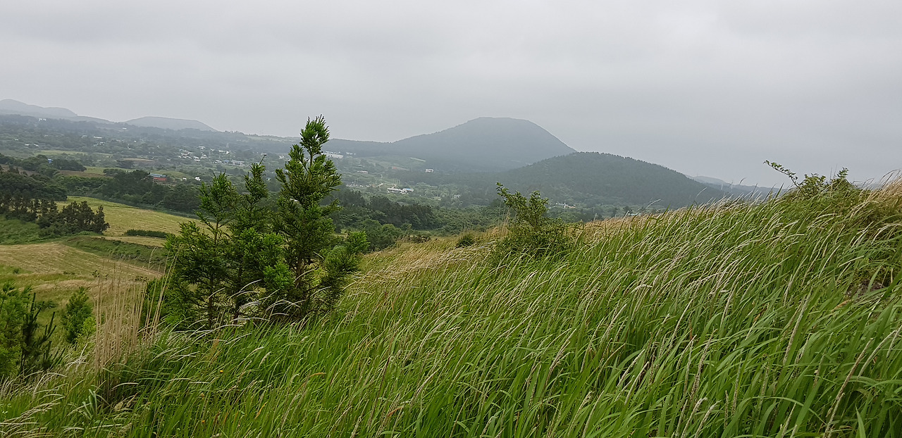 밭을 가로지르고 나면 목초들이 바람에 한들거리며 방문객을 맞고 있다. 나지막한 동네 언덕을 오르는 이 기분에 주변을 둘러봐야 밭밖에 보이지 않지만 하가로운 농촌의 풍경, 특히나 제주 중산간의 풍경이 유유자적하게 펼쳐지는 느낌이다. 이런 날 날씨가 뙤약볕이었으면 굉장히 싫었을 것이다. 다행히 충분히 마음을 가라앉힐 만큼 하늘에 구름이 잔뜩 끼었다. 이런 날씨를 좋아하지는 않지만 가벼운 트레킹을 하기에는 좋은 날씨다.