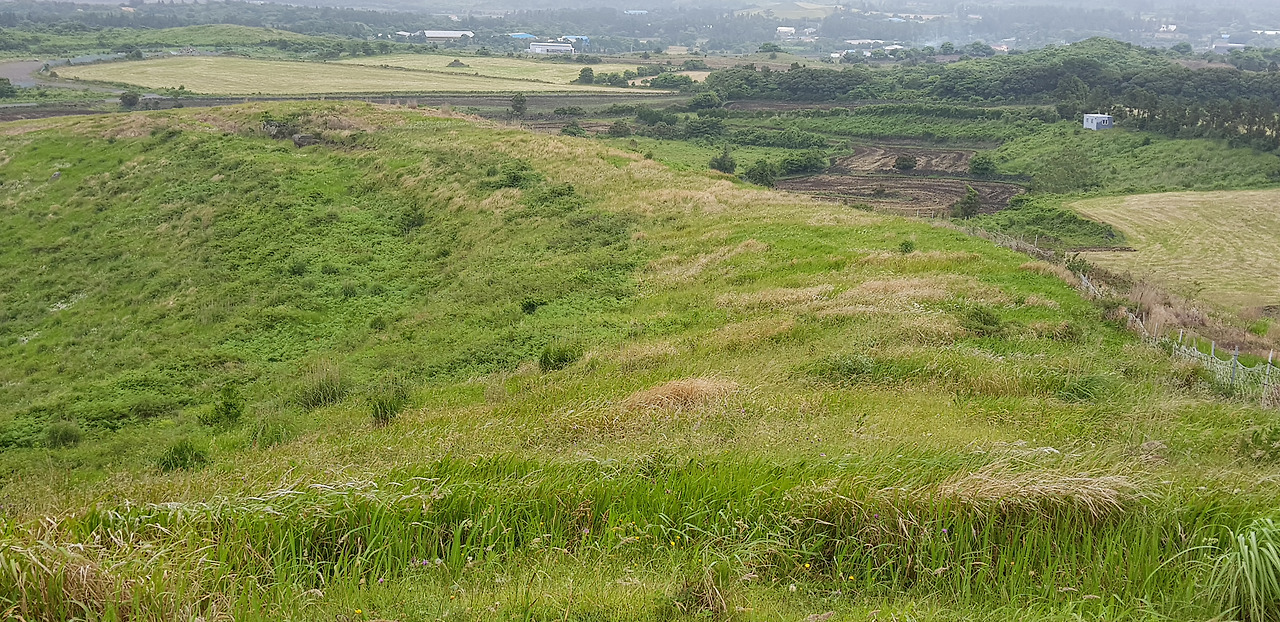 풀밭 사이를 걷는 느낌은 대단히 여유롭다. 이 지역에 어린 시절을 보냈으면 이 동산을 굉장히 즐겁게 뛰어다녔을 만한 곳이다. 불행히도 분화구가 깊지 않아 안쪽까지 모두 밭으로 개간되어 사용 중이다. 이 오름도 분명 사유지일 것 같다. 오름을 오르는 가운데로 철망을 두른 경계선이 정상 끝까지 이어져 있다. 처음 오르던 풀밭으로 가다 보니 오름 정상 부근에서 철조망으로 막혀 더 이상 길을 가기가 어렵다. 어디선가 철책을 넘어야 한다. 그래야 오름의 나머지 부분을 가볼 수 있다. 만만한 장소를 찾다 보니 많은 사람들이 넘었던 흔적이 남아있다. 다른 사람들도 나와 같은 필요에 의해 철망을 넘을 장소를 찾았을 것이고 여러 명의 반복적인 방문에 길 아닌 통행로의 흔적이 남은 셈이다.