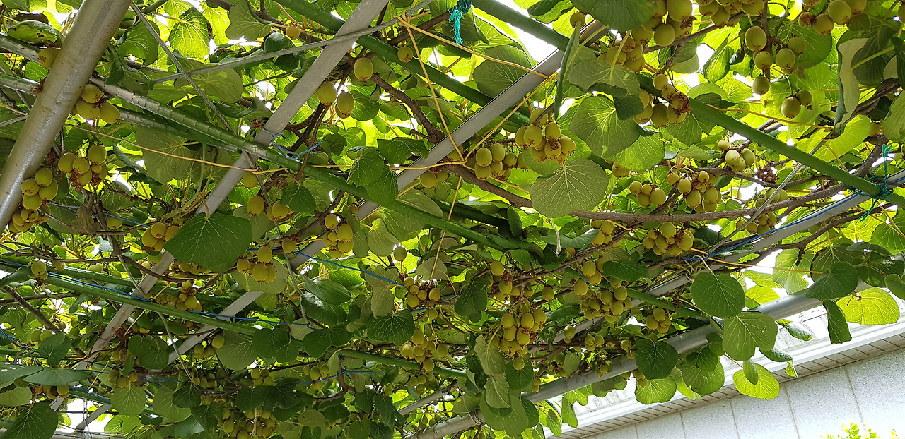 흔히 등나무가 있을 것으로 예상되는 곳에 등나무 대신 다양한 열매가 열려있다. 등나무에 저런 열매가 열리려나 싶어 자세히 보니 키위, 아니 참다래가 열려있다. 너무나 많이 열려 일부 솎아낼 필요는 있어 보이지만 등나무 잎으로 가득 찰 하늘에 키위가 걸려있으니 포도 같기도 하고 조금은 낯선 모습이다.