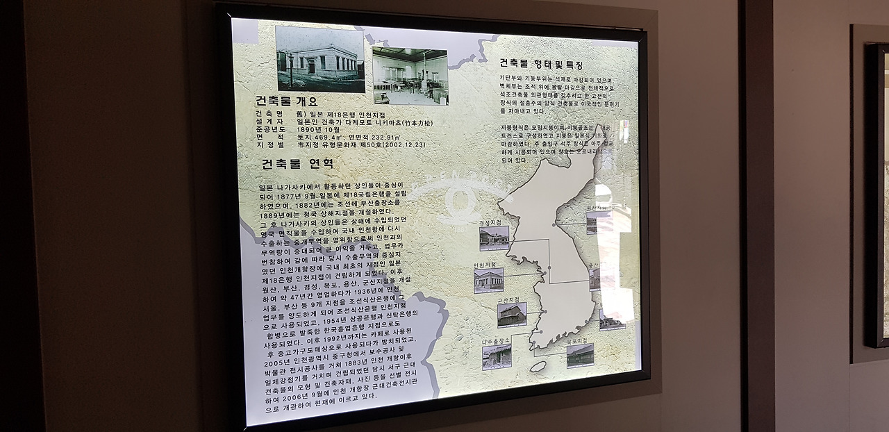 건물에 들어가 보니 건물은 일본 제1은행 인천지점 건물이다. 건물 내에는 인천지역에 근대에서부터 자리 잡은 다양한 형태의 기관이나 학교 교회 등에 대한 설명이 자세히 기록되어있다. 지역의 역사관 역할을 하고 있는 모양이다.
